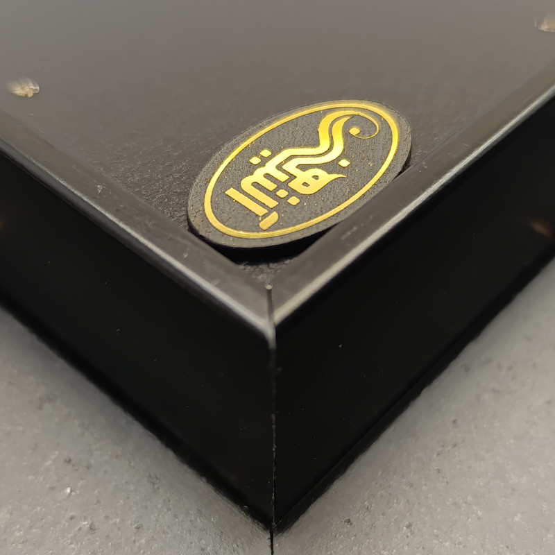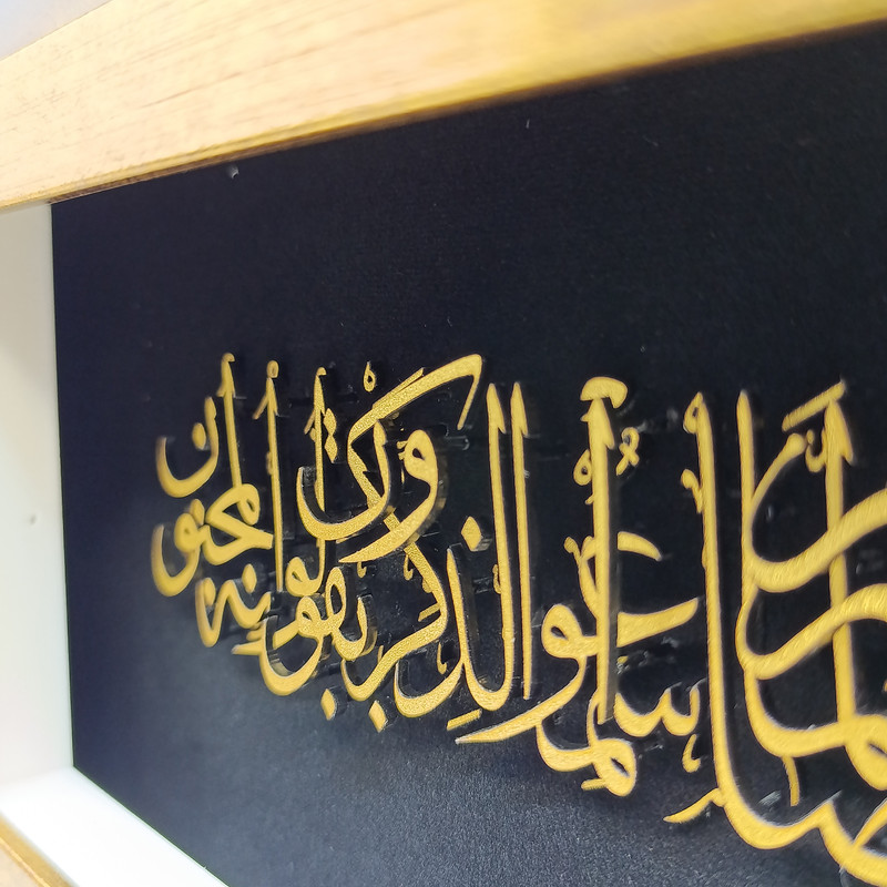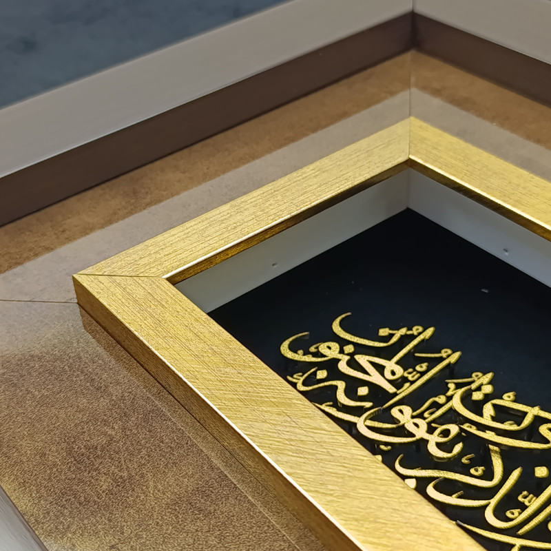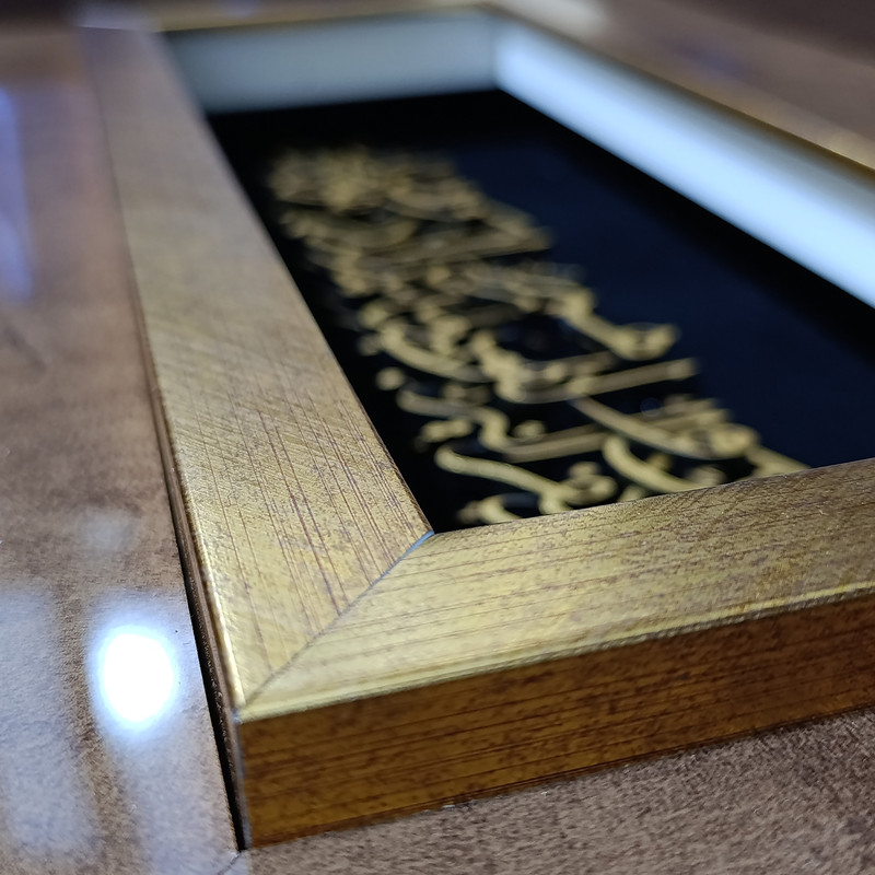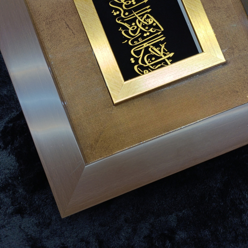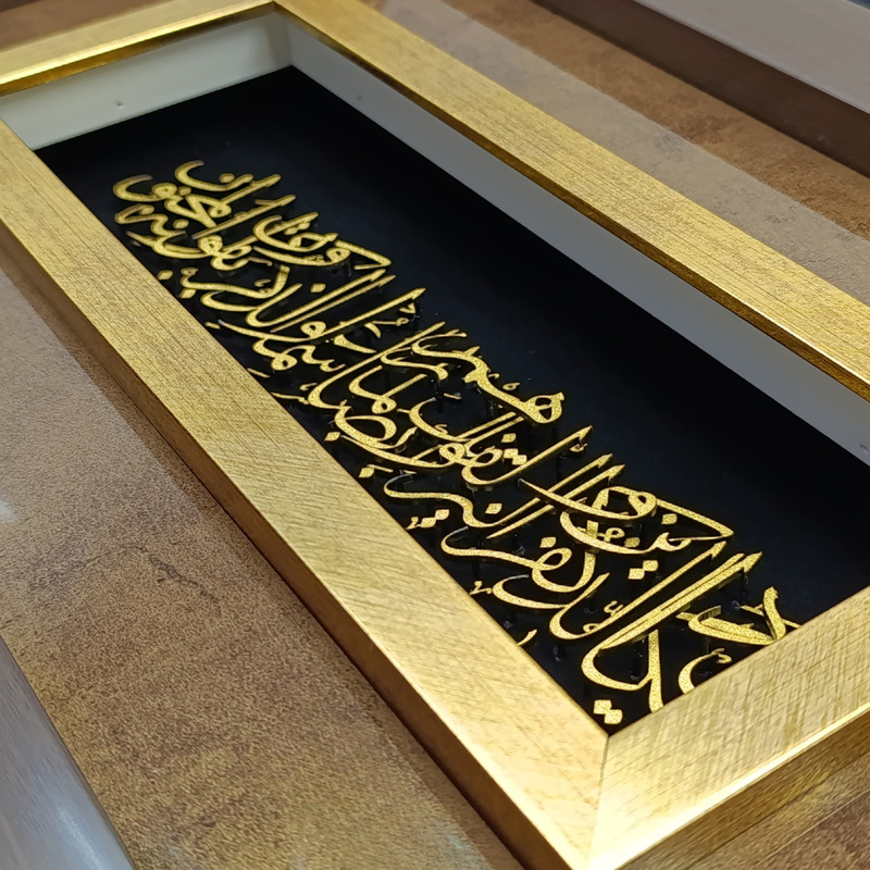 رنگ طلایی نوشتهها در تضاد با زمینه مشکی، جلوهای باشکوه و فاخر ایجاد کرده و تابلو را به اثری ماندگار و مناسب برای فضاهای مختلف تبدیل کرده است.