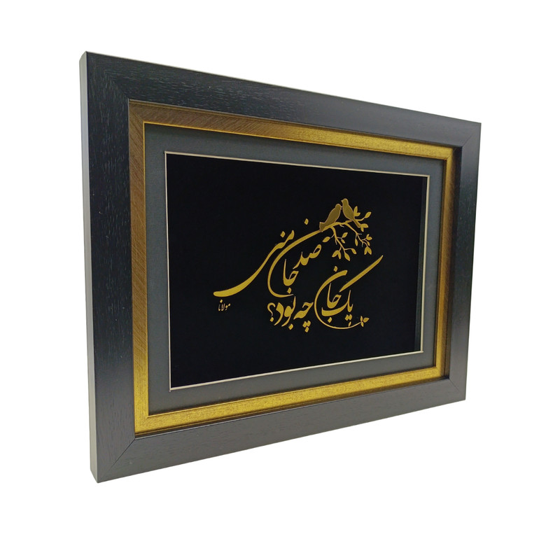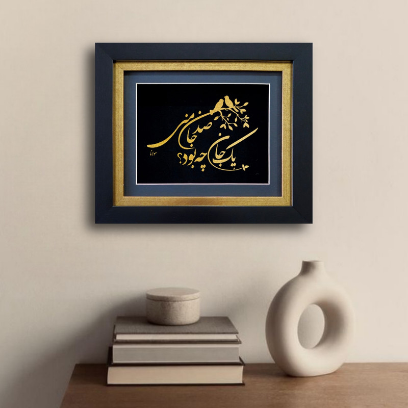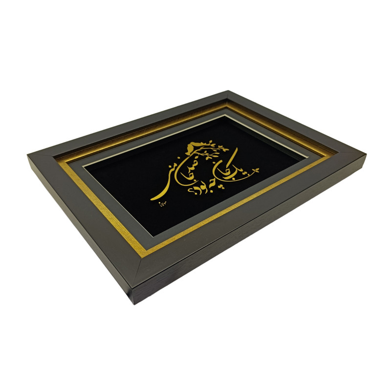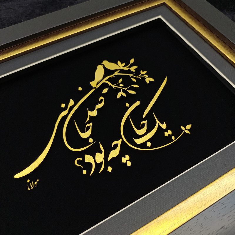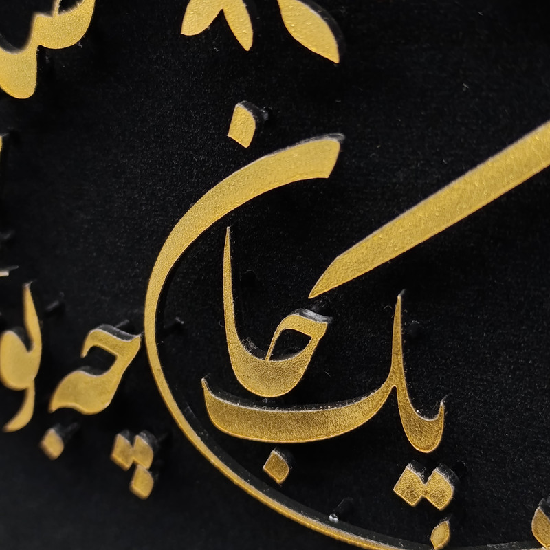 این تابلو هنری جلوهای زیبا از تلفیق خوشنویسی فارسی و هنر تزیینی است که با رنگ طلایی درخشان بر زمینهای مشکی خلق شده است. متن اثر برگرفته از یکی از ابیات ناب مولاناست: