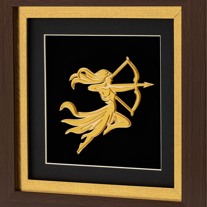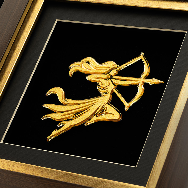 در تابلوی آذرماه، کماندار طلایی با حرکتی هدفمند و پویا، نماد آزادی و آرمانگرایی است. نماد از ورق طلا ساخته شده و طراحی آن با دقتی هندسی روی پسزمینهی تیره کار شده است. قاب پیویسی براق، تابلو را در برابر رطوبت و گردوغبار محافظت کرده و ماندگاری رنگها را تضمین میکند. این تابلو جلوهای از پویایی و قدرت ذهنی است که فضای هر خانه یا دفتر را خاصتر میکند.