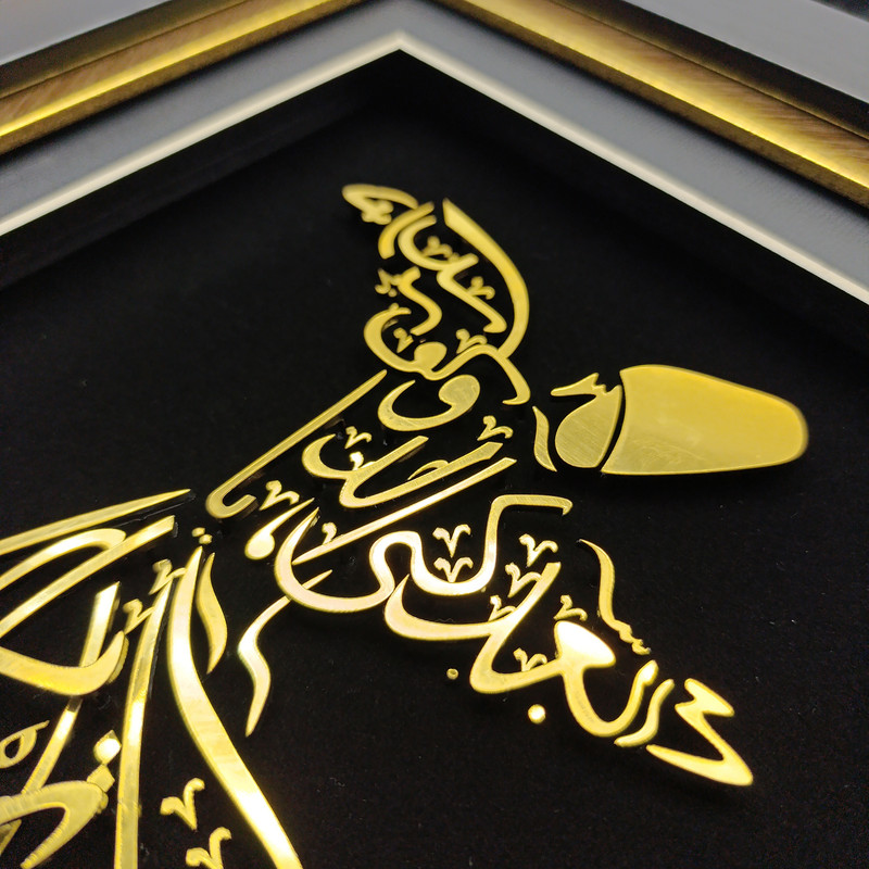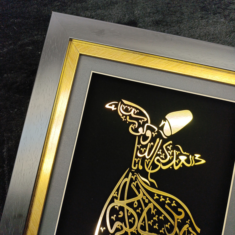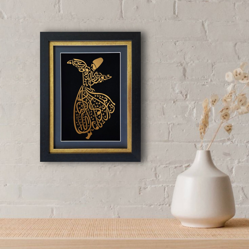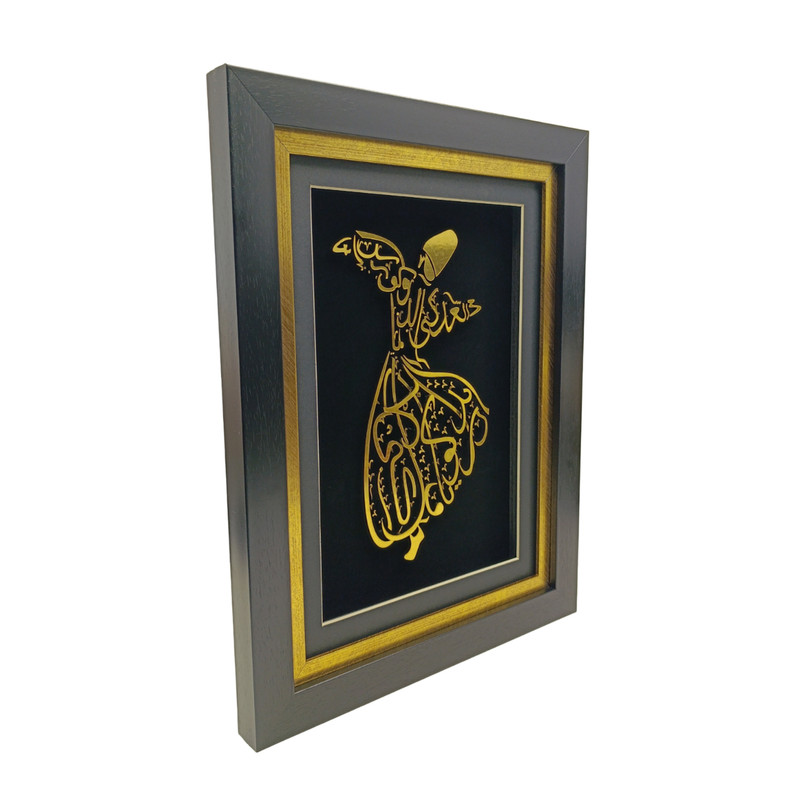 تابلوی «رقص سماع» جلوهای باشکوه از هنر ایرانی ـ اسلامی است که با ترکیب خطاطی و تصویرسازی، روحانیت و زیبایی این آیین عرفانی را به نمایش میگذارد. در این اثر، تصویر درویش چرخان با خطوط طلایی بر زمینهی مشکی طراحی شده و با قاب شیک و برازندهای همراه است که بر درخشندگی و شکوه آن میافزاید.