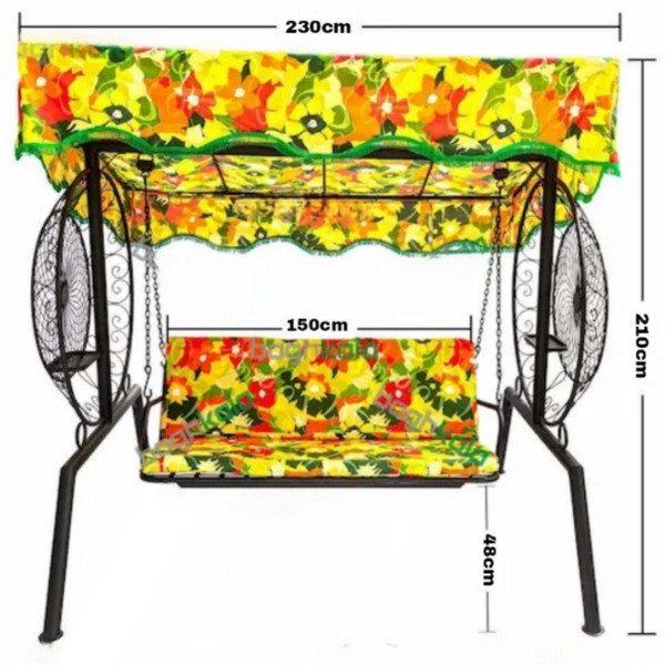 تاب باغی و تاب حیاطی در سایز سه نفره تولید میشود. رنگ بدنه تمام تاب ها کورهای الکترواستاتیک در دو رنگ سفید و مشکی میباشد. پارچه تشک درون آن الیاف ویژه به کار برده شده و رنگ روکش تاب قابل انتخاب میباشد. ابعاد نشیمن سه نفره 50×150 سانتی متر میباشد.