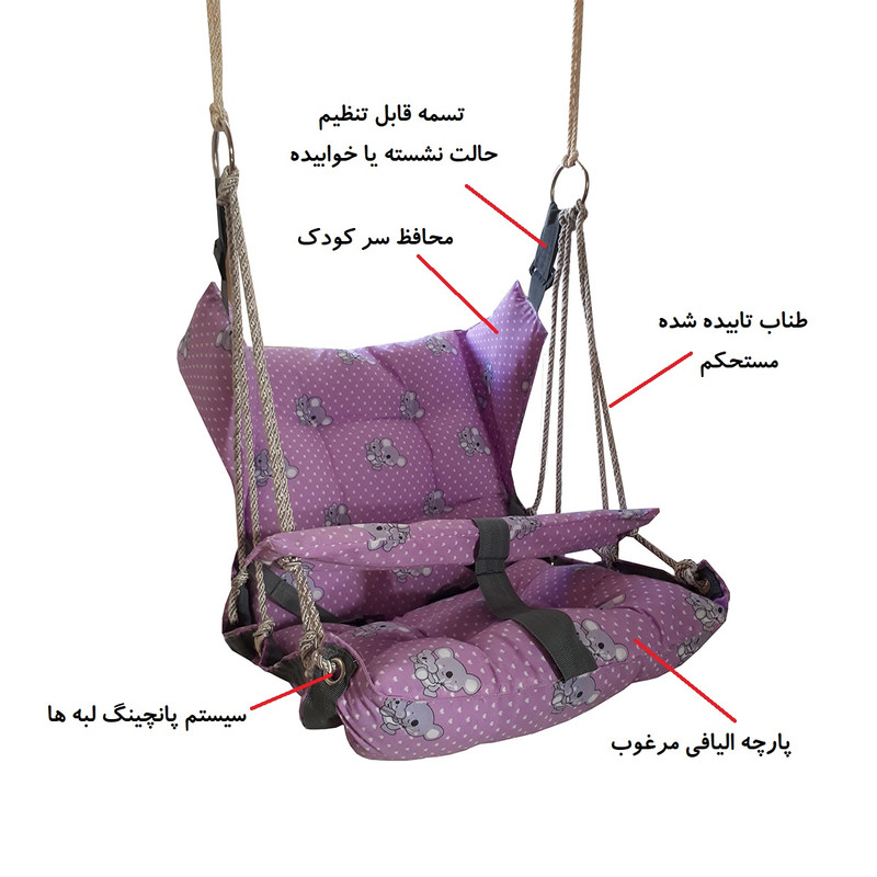 تاب ضد رفلکس طرح کوالا نینو، دارای تجهیزات ایمنی مناسب مانند کمربند ایمنی، محافظ سر نوزاد، مانع جلو پا و تسمه تنظیم می باشد و همچنین بدلیل روش بسته شدن طناب های استفاده شده در ساخت آن، ایمنی جانبی را برای حفظ فرزند شما درون خود ایجاد می نماید. همچنین، فیزیک این تاب به گونه ای میباشد که قابیلت های مختلف نشستن و خوابیدن را برای کودک ایجاد نموده و برای جلوگیری و درمان رفلاکس سیستم گوارش نوزاد کمک شایانی می کند و در واقع در ساخت آن، به ارگونومی و فیزیک مناسب قرارگیری بدن نوزاد توجه ویژه شده است. شیب قرارگیری تاب و بدن نوزاد شما با توجه به تسمه بالایی قابل تنطیم است و همچنین، جنس الیاف و پارچه استفاده شده در این تاب مرغوب بوده و از بروز حساسیت و یا آسیب به بدن نوزاد شما جلوگیری خواهد کرد. بدلیل مقاومت مناسب طناب و نشمین گاه این تاب، توانایی استفاده برای فرزندان شما تا سن 4- 5 سال و وزن 25 کیلو را دارا می باشد. همچنین، طناب های تاب از نوع بافته شده و با مقاومت بالا می باشند.