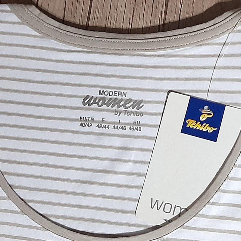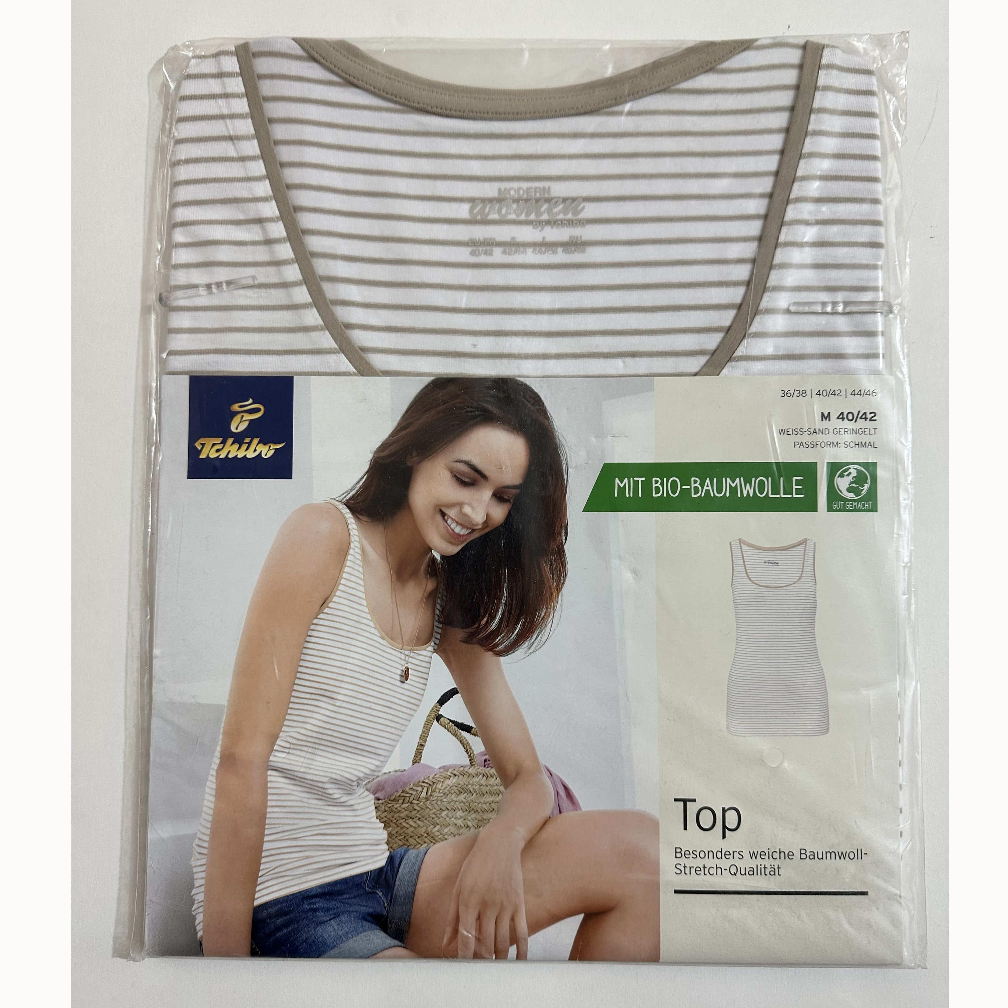 تاپ زنانه راه راه کرم چیبو (TCHIBO) تولید کشور آلمان می باشد. کیفیت اجناس این برند آلمانی فوق العاده بالا بوده و از دوام خوبی نیز برخوردار است. جنس این تاپ از 96 درصد نخ و 4 درصد الاستین تشکیل شده است که موجب دوام، مقاومت در برابر پارگی و رنگ رفتگی می شود. همچنین قد این تاپ زنانه 64 سانتی متر می باشد.
