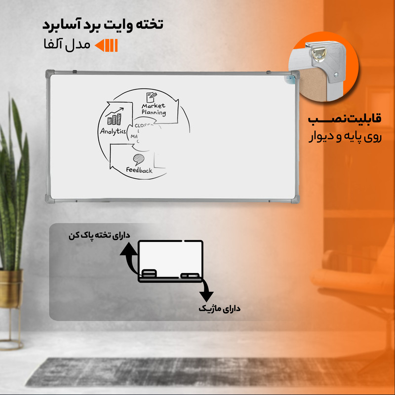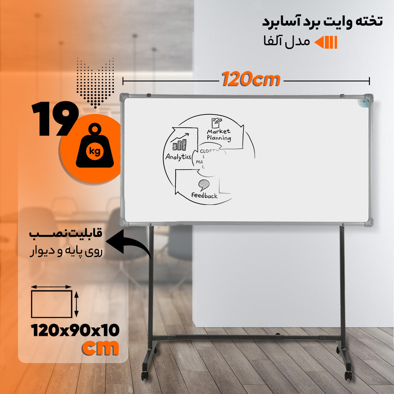 تخته وایت برد آسابرد مدل آلفا سایز 120 × 90 سانتی‌ متر به همراه پایه نگهدارنده