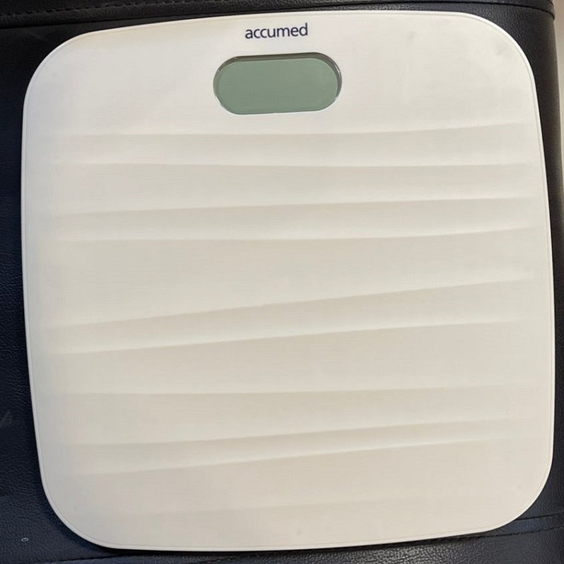 ترازوی «اکیومد» (Accumed) مدل «SC9760» : حداکثر وزنی که این ترازو قادر به اندازهگیری آن بوده، 180 کیلوگرم است و اگر وزنی بیشتر از این مقدار روی آن قرار بگیرد، عبارت O-Ld روی صفحه ظاهر میشود. برای روشنکردن ترازو کافی است با پا چند ضربه روی آن بزنید تا سنسورهای اندازهگیری وزن، ترازو را روشن کنند. دقت اندازهگیری وزن 100 گرم است و این یعنی تغییرات وزن کمتر از 100 گرم را تشخیص نمیدهد. البته حتی یک لیوان آب هم وزنی بیشتر از این مقدار دارد. برای اینکه سنسورهای زیر ترازو بتوانند وزن را بهدرستی اندازهگیری کنند، ترازو باید روی سطحی کاملا صاف و بدون ناهمواری مانند سنگ و سرامیک قرار بگیرد. نمایشگر ترازو از نوع LCD است و عدد وزن را بزرگ و خوانا نشان میدهد.