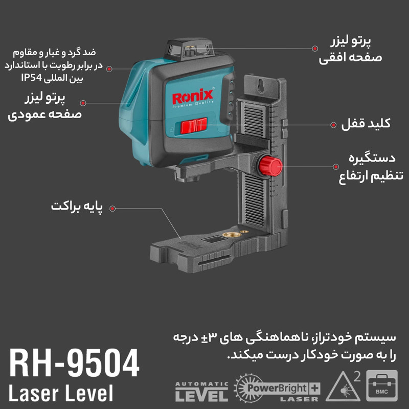 | ویژگیهای تراز لیزری | باتری , دارای سیستم تراز خودکار , قابلیت نصب روی پایه , قابلیت نمایش خط , قفل تراز , نمایش خط لیزر افقی , نمایش خط لیزر عمودی |