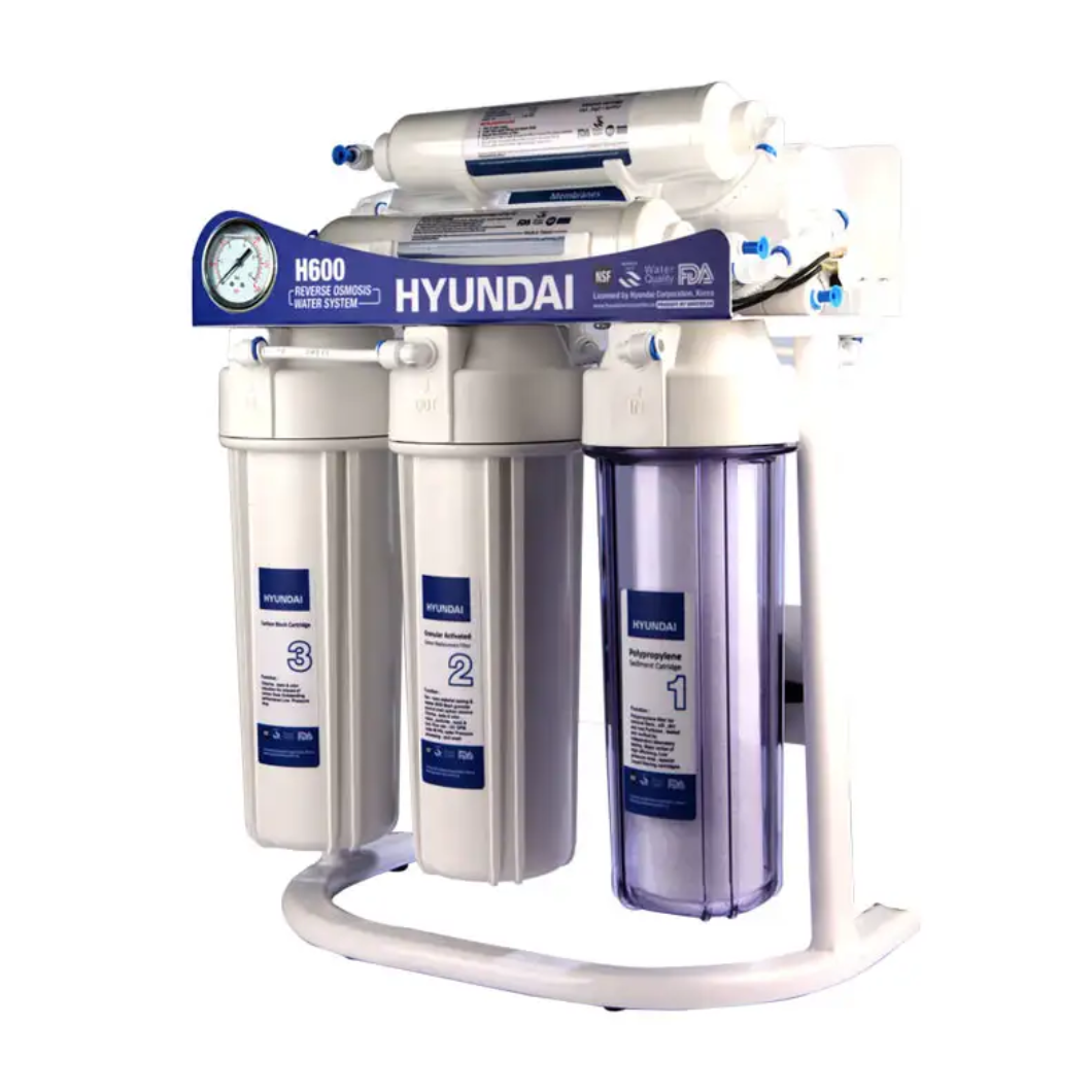 دستگاه تصفیه آب هیوندای مدل H600 هیوندایh600 یکی از اقتصادی انواع دستگاههای تصفیه آب هیوندا است که ۶ مرحله فیلتراسیون به روش اسمز معکوس دارد. دستگاه تصفیه آب هیوندای H600 دارای مخزن متوسط که مناسب یک خانوادهی پر جمعیت میباشد. برای طراحی بدنه این دستگاه از فلز استفاده شده است تا ساختار فیزیکی مقاوم و ماندگاری داشته باشد. مشخصات هیوندای H600 دستگاه تصفیه آب هیوندا مدل H600 در ابعاد ۴۵*۳۶*۴۵ سانتیمتری و با وزن ۲۰ کیلوگرمی طراحی شده است. پمپ این دستگاه با اتصال برق شهری ۲۲۰ ولت تک فاز کار میکند. حداکثر ظرفیت این دستگاه ۲۸۰ لیتر آب در هر شبانهروز میباشد. همچنین در طراحی مدل H600 از ۶ مرحله فیلتراسیون استفاده شده است که به ترتیب لیست زیر هستند. مراحل تصفیه HYUNDAI H600 فیلتر الیافی (PP) فیلتر کربن (UDF) فیلتر کربن بلاک (CTO) فیلتر ممبران فیلتر پست کربن فیلتر مینرال ویژگی های اصلی دستگاه تصفیه آب هیوندای مدل H600 تصفیه ۶ مرحله با فیلترهای مرغوب دارای گارانتی معتبر 2 ساله تصفیه به روش اسمز معکوس (R.O) فیلترهای pp، کربن گرانول، کربن بلاک، ممبران RO، پست کربن کپسولی، مینرال