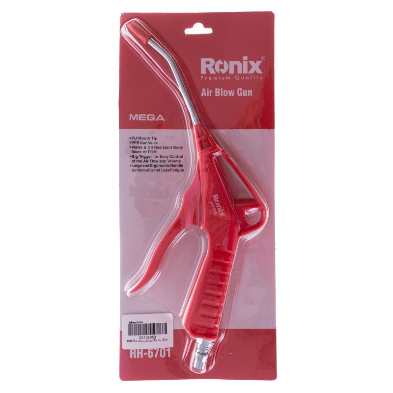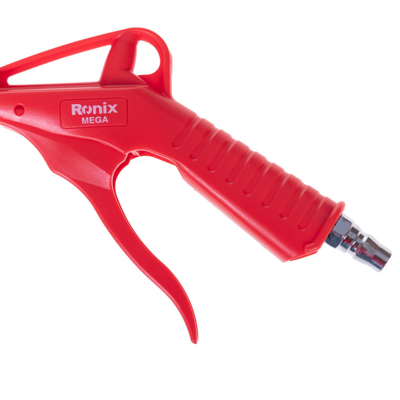تفنگی باد یا باد پاش از جمله ابزارهایی است که برای پاکسازی سطوح و تراشهها و از این قبیل فعالیت ها مورد استفاده قرار میگیرد. این ابزار با ساختاری مشابه تفنگ، به کمپرسور هوا وصل میشود و با شدت باد سطوح را پاک میکند.یکی از نمونههای با کیفیت و محبوب این دسته، تفنگ باد مگا رونیکس مدل RH-6701 است.شرکت رونیکس برای ساخت این تفنگی باد، از نازلی ضد زنگ با طول 10 سانتیمتر استفاده کرده است. جنس نوک نازل این ابزار، از پلی اورتان (PU) و جنس بدنهی آن از پلیاکسیمتیلن (POM) است. شیر اسلحهای انتهایی این محصول هم، از جنس پلی فنیلن سولفید (PPS) ساخته شده است.باد پاش رونیکس با حداکثر فشار 16 بار و سطح صدای 90 دسی بل، ظرفیت جریان خروجی 500 لیتر بر دقیقه را داراست. دسته این ابزار به صورت تفنگی با ساختار ارگونومیک است. ماشهی بلند این درجه باد، این امکان را به کاربر میدهد تا به راحتی آن را در دست بگیرد و کنترل مناسبی بر روی جریان و حجم هوا داشته باشد.این محصول رونیکس که مگا Mega نام دارد، بسیار سبک و خوش دست به وزن 125 گرم است و در برابر آب و روغن، به خوبی دوام خواهد آورد.