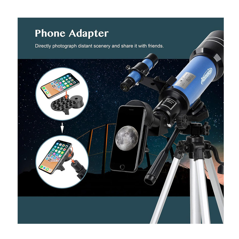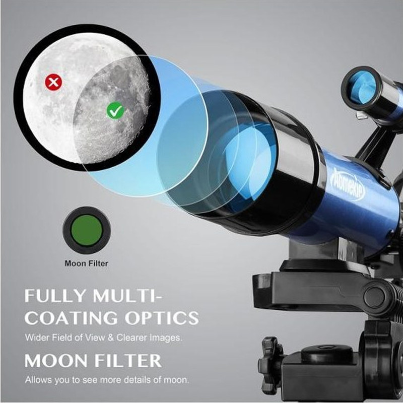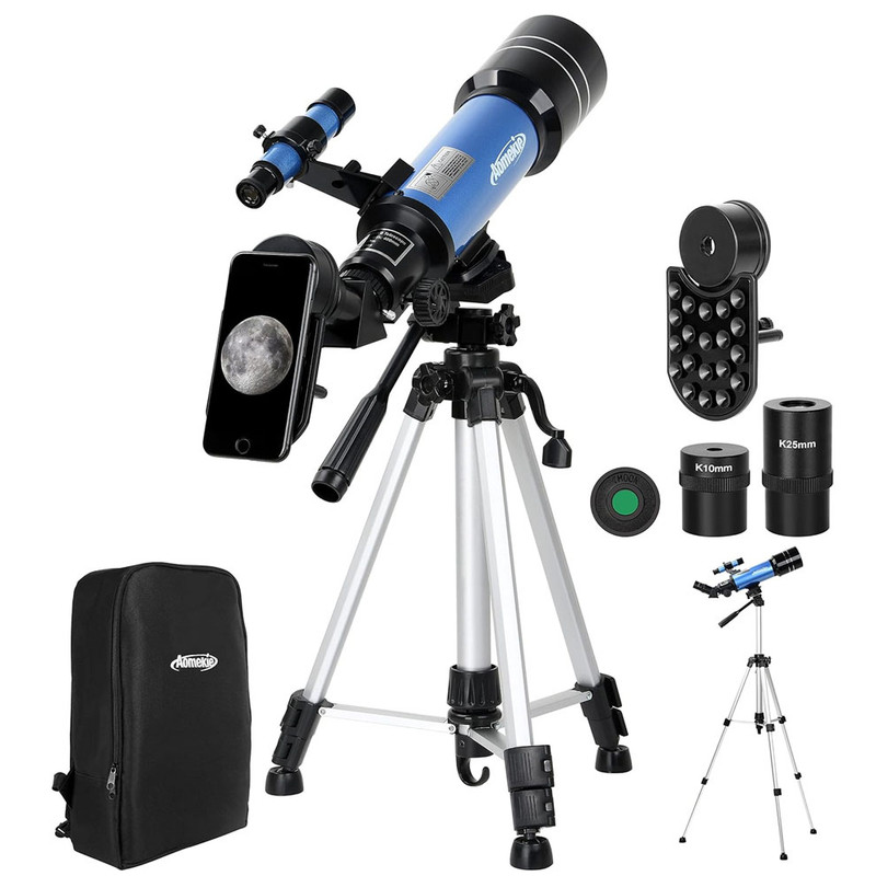 تلسکوپ AOMEKIE مدل 40070BG یک تلسکوپ شکستی چندمنظوره است که برای طبیعتگردی و رصد نجومی طراحی شده است. این تلسکوپ با سیستم اپتیکی گالیلهای، کوله پشتی حمل و لوازم جانبی کامل، همراه مناسبی برای علاقهمندان به طبیعت و نجوم است.این تلسکوپ با سیستم اپتیکی حرفهای بهرهگیری از لنزهای با پوشش کامل نوری و قطر دهانه 70 میلیمتری، تصاویری شفاف و با کنتراست عالی ارائه میدهد. فاصله کانونی 400 میلیمتر و نسبت کانونی f/5.7، تعادل مناسبی بین میدان دید و بزرگنمایی ایجاد میکند.