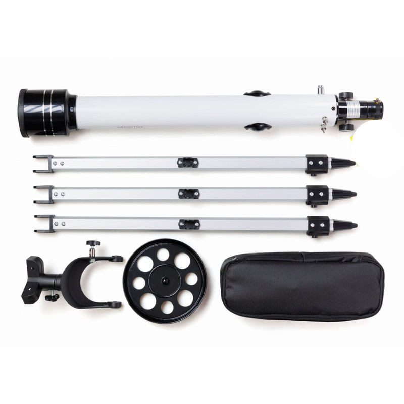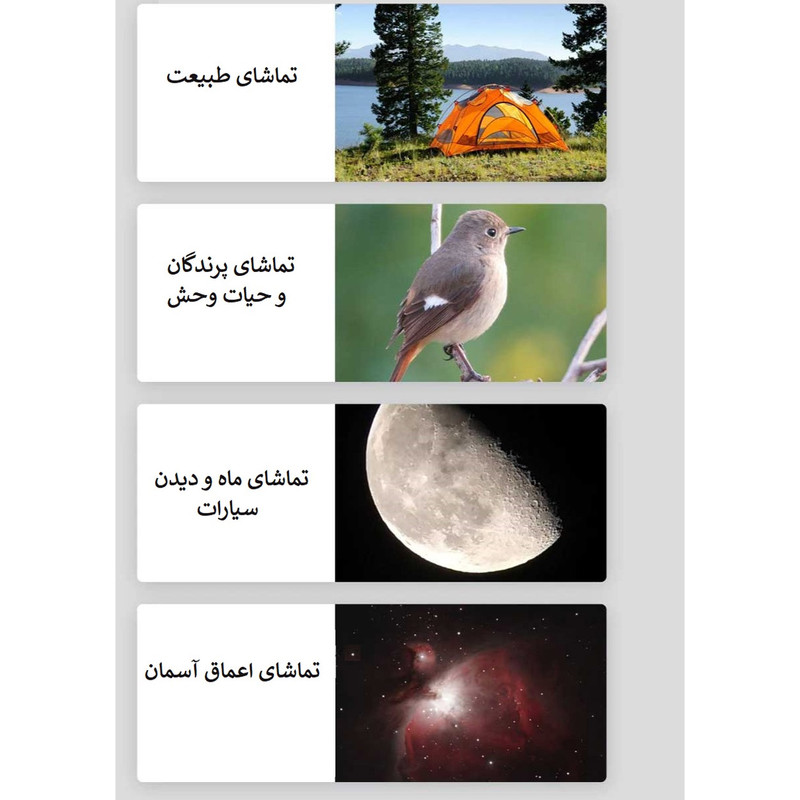 | سایر قابلیتها | لوله تلسکوپ شکستی ۶۰ میلیمتری آکروماتیک - فیلتر رصد ماه - رابط عکاسی با موبایل - بارلو ۳ برابر -بارلو ۳ برابر- سه پایه آلومینیومی -مقر چنگالی AZ-سه چشمی ۲۰ (۳۵برابر بزرگنمایی)، ۱۲٫۵ (۵۶ برابر بزرگنمایی)، ۶ (۱۱۶ برابر بزرگنمایی)-لوازم جانبی کامل و دارای کیف حمل با کیفیت-ابزاری بسیار مناسب برای کودکان و دانش آموزان و رصدگران تازه کار- به همراه پشتیبانی گام به گام جهت نصب و راه اندازی محصول با کارشناس فنی |