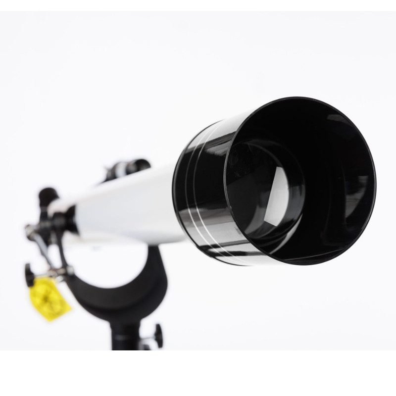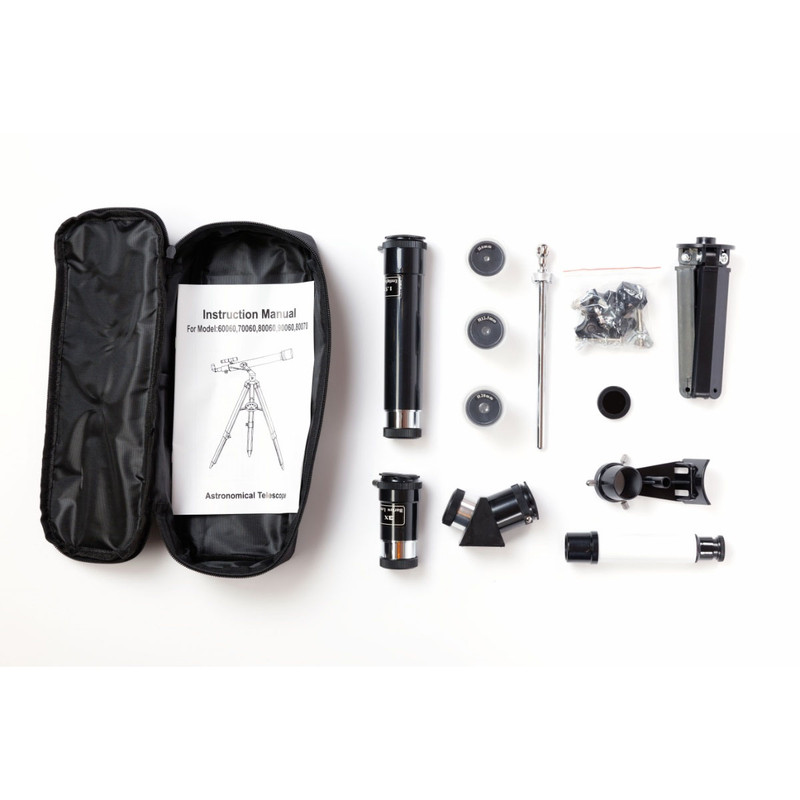 تلسکوپ شکستی 60 میلیمتری نایت اسکای مدل 60AZ یک تلسکوپ گالیلهای (استفاده از عدسی جهت گردآوری نور) است که هم برای مشاهده اجرام آسمانی و هم برای مشاهده مناظر زمینی قابل استفاده است و جزء اولین تلسکوپهای پیشنهادی ما برای کودکان، دانش آموزان و حتی رصدگران تازهکار است. 60AZ یک تلسکوپ آکروماتیک کوچک و قابل حمل با قطر عدسی شیئی 60 میلیمتر (با توان گردآوری نور 70 برابر چشم انسان) و فاصله کانونی 700 میلیمتر است که با توجه به سادگی در عملکرد و استفاده، ابزاری ایدهآل برای شروع یادگیری و ورود به دنیای شگفتانگیز رصد و نجوم است.وزن لوله تلسکوپ و لوازم همراه مانند چپقی 90 درجه مستقیمکننده، سه عدد چشمی 6، 12٫5 و 20 میلیمتر، جوینده 5 در 24، بارلو 3 برابر کننده و رابط عکاسی موبایل و فیلتر ماه در حدود یک کیلوگرم و سه پایه و مقر سمتیارتفاعی AZ نیز 1٫5 کیلوگرم است، که همگی به سادگی داخل کیف حمل برزنتی جا شده تا جابهجای و حمل و نقل تلسکوپ بسیار آسان باشد.وجود چپقی 45 درجه مستقیمکننده که وارونگی تصویر را به طور کامل اصلاح میکند باعث شده تا آنچه از درون تلسکوپ میبینید کاملا مناسب مشاهده مناظر زمینی باشد.دیگر وسیله جذاب همراه پایههای آلومینومی قابل تنظیم سه پایه به شما این امکان را میدهد که ارتفاع تلسکوپ را به میزان مورد نیاز تغییر داده و یا حتی رو سطوح ناهموار نیز آن را تراز کنید. این پایهها از آلومنیوم مرغوب ساخته شدهاند و دوام و عمر مناسبی دارند.60AZ رابط عکاسی با گوشی هوشمند است. این وسیله به شما امکان میدهد از پدیدههای نجومی و یا زمینی به راحتی و با استفاده از گوشی همراه خود عکس و فیلم بگیرید.ه پایه و مقر سمتارتفاعی از نوع چنگالی است که به خوبی تلسکوپ را در محل خود نگه میدارد و دارای یک پیچ حرکت دقیق در محور عمودی است که به شما امکان میدهد تلسکوپ را روی سوژه انتخاب شده به طور دقیق تنظیم کنید. سه پایه آلومینومی دارای یک سینی لوازم جانبی است که علاوه بر محلی برای قراردادن لوازم همراه تلسکوپ، به استحکام پایه نیز کمک میکند