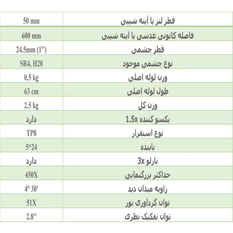 | سایر قابلیتها | فاصله کانونی ۶۰۰ - قطر دهانه ۵۰ - دارای سه پایه بلند با قابلیت تنظیم ارتفاع - دارای مستقیم کننده و یکسوکننده ۱.۵برابر - جوینده ۲۴x۵ - به همراه بارلو تقویت کننده ۳برابر و ۲عدد چشمی ۴-۱۲ -بدنه مقاوم فلزی - به همراه پشتیبانی فنی گام به گام جهت نصب و راه انداری تا مشاهده تصاویر به همراه کارشناس- |