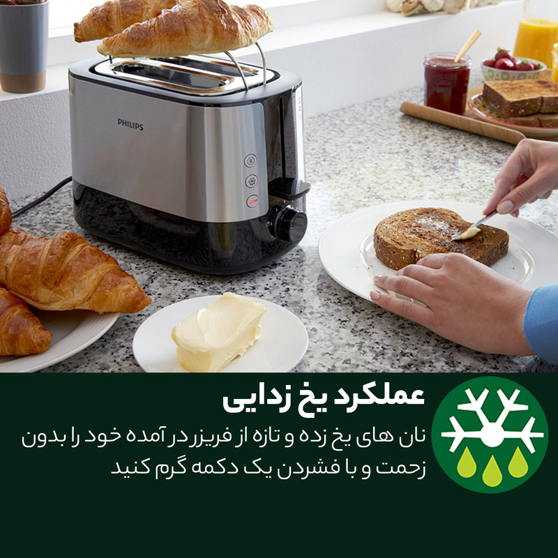 توستر فیلیپس HD2637 دارای توان 950 وات بوده و یکی از قدرتمند ترین انواع توستر است. بهره گیری از سیستم گرمایشی المنت باعث می شود، کیفیت گرمای خروجی و همچنین طول عمر این محصول بیشتر شود. دستگاه 2637 دارای بدنه ای به رنگ استیل است و امکان هماهنگ شدن با انواع دیزاین محیط آشپزخانه های مختلف را دارا می باشد. وزن این توستر 1.5 کیلوگرم که باعث می شود به راحتی بتوانید محل قرارگیری آن را تعویض کنید. سیم برقی که برای این توستر در نظر گرفته شده 85 سانتی متر است که در مقایسه با توستر های دیگر طول سیم بلندتری به حساب آمده و امکان قراردادن آن را در فواصل دور تر از پریز برق ممکن می کند. توستر PHILIPS دارای دو درگاه نان بوده و دو قطعه نان را می تواند برای شما برشته کند. سیستم کنترل در این محصول به صورت دکمه ای و چرخشی طراحی شده که باعث سهولت استفاده برای شما شده و شکل بصری توستالژیک و زیبایی برای محیط شما بوجود می آورد. جنس بدنه در این توستر از استیل ضد زنگ انتخاب شده که استحکام مناسبی برای استفاده طولانی مدت در اختیار شما قرار دهد.
