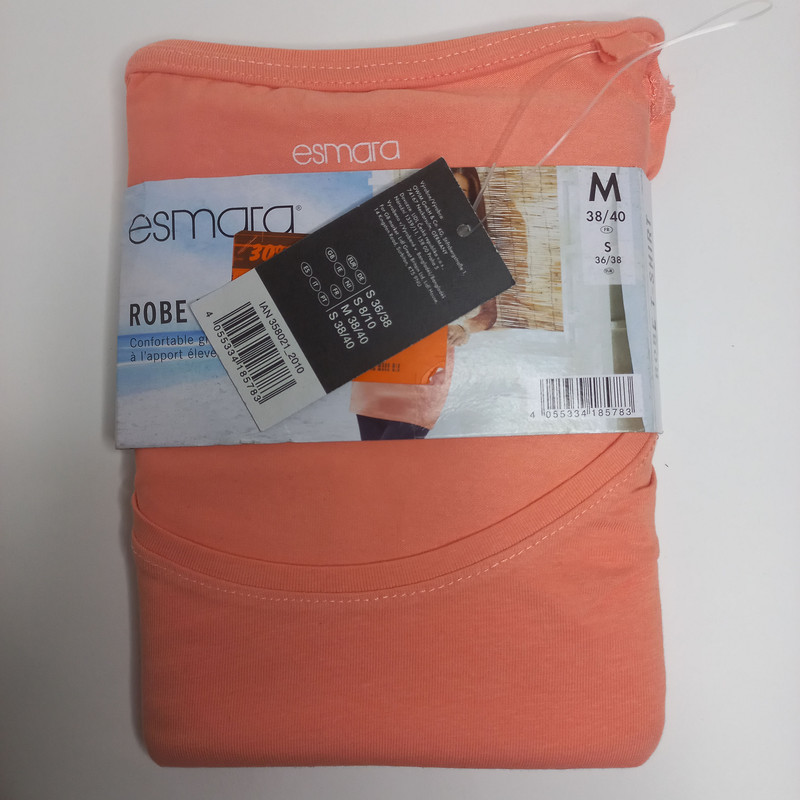 برند esmara از مجموعه تولیدات شرکت Lidlآلمان می باشد که به صورت تخصصی پوشاک زنانه تولید مینماید.جنس بسیاری از لباس های تولیدی این برند از 100 درصد پنبه است که توانسته گواهی OEKO_TEX را که از جمله معتبرترین گواهینامه های کیفی اروپا می باشد را تصاحب کند. تیشرت زنانه اسمارا آمیخته ای از 95 درصد نخ و پنبه و 5 درصد الاستین می باشد و چون بر چسب کیفیت دارد هیچگونه حساسیتی ایجاد نمی کند. لازم به توضیح است سایزبندی این لباس بر اساس سایزهای اروپایی یورو ( EUR ) می باشد و نوع استایل اصلی در عکس ها نشات دهنده جذب یا آزاد و یا بلند و کوتاه بودن لباس است . در کل سایز لباس های ایرانی نسبت به سایزهای آلمانی ( EUR ) در اکثر مواقع یکی نیست. به طور کلی برای انتخاب لباس آلمانی شما باید یک سایز از سایز لباس ایرانی خود را کم کنید به عنوان مثال اگر در سایز ایرانی XL می پوشید باید در سایز آلمانی L را انتخاب کنید حتما جدول تبدیل سایزهای ایرانی به آلمانی را در قسمت عکسها مطالعه بفرمایید