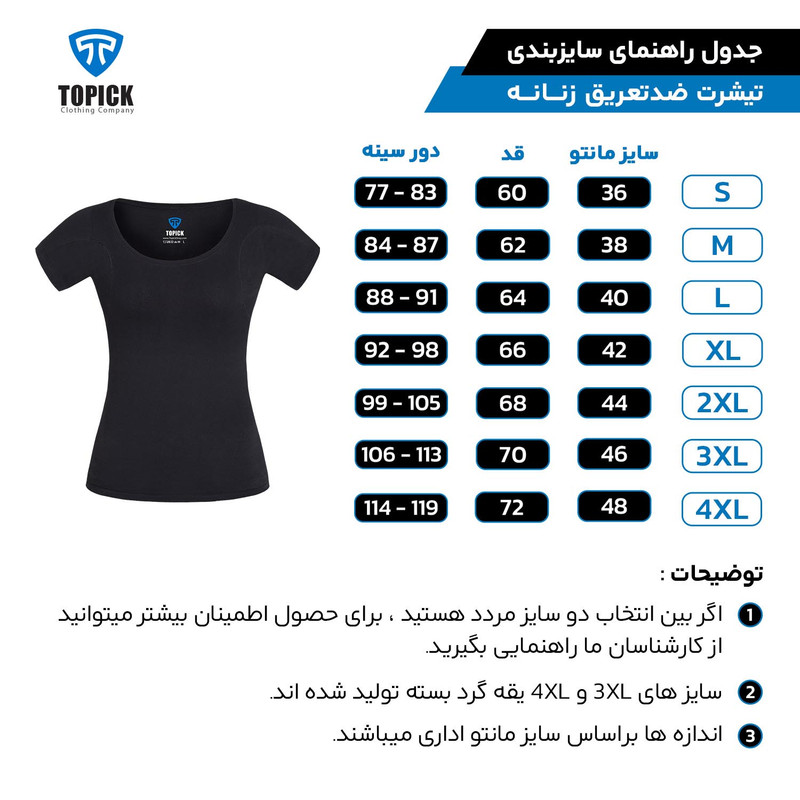 تیشرت ضدتعریق تاپیک برای افرادی مناسب است که تعریق معمولی دارند. این تیشرت با داشتن لایه محافظ در ناحیه زیربغل، مانع از بوی ناخوشایند و لکههای خیسی روی لباس شما میشود و اعتماد به نفس بیشتری به شما میبخشد. خاصیت ضدتعریق این محصول، علاوه بر کاهش نیاز به شستشو، باعث افزایش دوام لباسها و حفظ راحتی و آرامش شما میشود. در فرآیند تولید این پارچه، باکتریهای مسبب بو نمیتوانند به داخل آن نفوذ کنند و از بین میروند. همچنین، این تیشرت از نخ پنبه 100% ساخته شده و ضدحساسیت است؛ بنابراین از بروز هرگونه حساسیت پوستی جلوگیری میکند. معیار سایزبندی تیشرت تاپیک، اندازه دور سینه است.