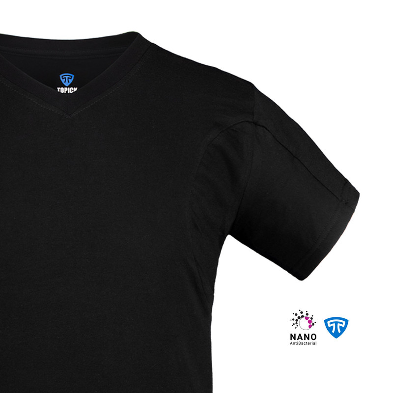 تیشرت ضد تعریق نانو آنتیباکتریال تاپیک برای افرادی مناسب است که تعریق بیش از حد دارند. این تیشرت دارای لایه محافظ در ناحیه زیربغل است که از بوی عرق و ایجاد لکههای خیسی روی لباس جلوگیری میکند و به شما اعتماد به نفس بیشتری میبخشد. فناوری نانو به کار رفته در این محصول، علاوه بر کاهش نیاز به شستشو، دوام لباس را افزایش میدهد و حس آرامش و راحتی بیشتری به شما هدیه میدهد. با استفاده از این فناوری، باکتریهای مسبب بو قادر به نفوذ در پارچه نیستند و در تماس با مواد نانو از بین میروند. تیشرت تاپیک ۱۰۰٪ از نخ پنبه تهیه شده و ضد حساسیت است؛ بنابراین از بروز هرگونه حساسیت پوستی جلوگیری میکند.