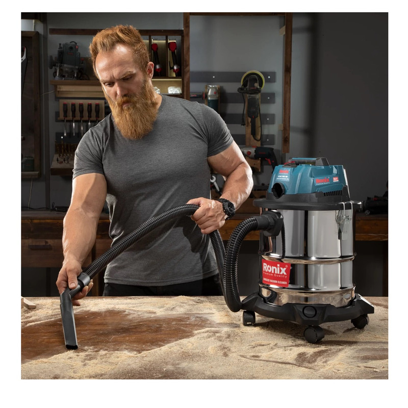 ویژگیهای جاروبرقی صنعتی | بدنه فلزی , پایهی چرخدار , چرخ پلاستیکی , دارای لوله تلسکوپی , قابلیت جمع کردن آب |
