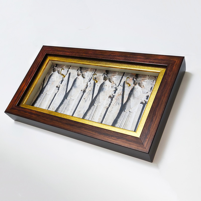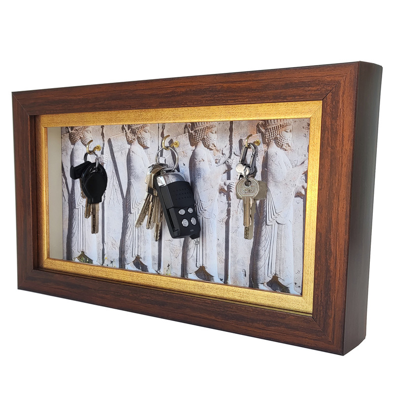 این جا کلیدی بسیار نفیس از دو قاب در داخل هم از جنس Pvc ساخته شده است که دارای سه جای آویز برای آویزان کردن کلید می باشد.در داخل این جا کلیدی همچنین از تخته 8 میلیمتری به همراه یک چاپ نفیس لمینت شده از اثر تاریخی باستانی تخت جمشید نصب شده است که جلوه ای بسیار زیبا به این جا کلیدی می دهد.شما به راحتی میتوانید با یک میخ این جا کلیدی را به دیوار نصب نمایید.