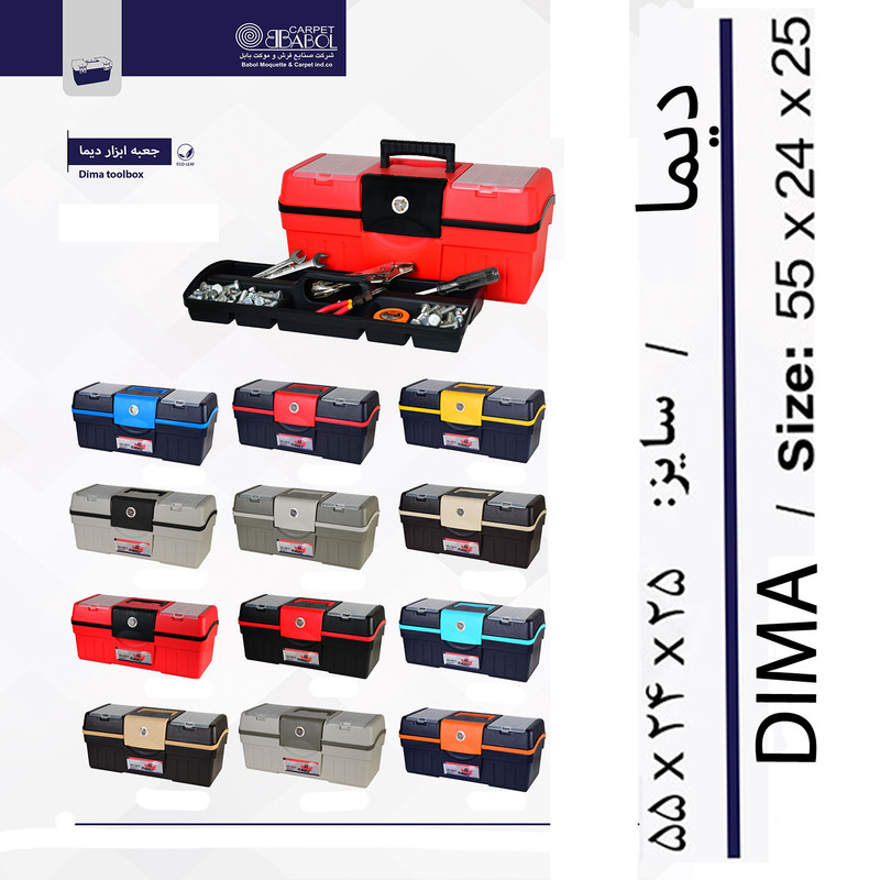 جعبه ابزار دیما با کاربرد حرفه‌ای و خانگی و سایز نسباُ بزرگ در رنگ بندی متنوع و مقاومت و دوام بالا دارای یک سینی مجزا و دوازده محفظه و ابعاد طول: 55 سانتیمتر عرض: 24 سانتیمتر ارتفاع: 25 سانتیمتر به بازار عرضه گردیده است.