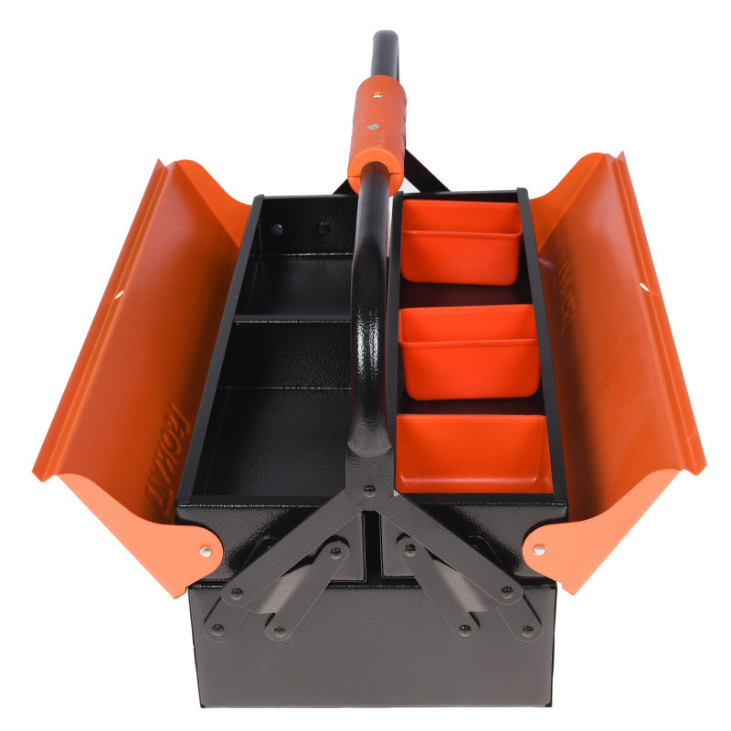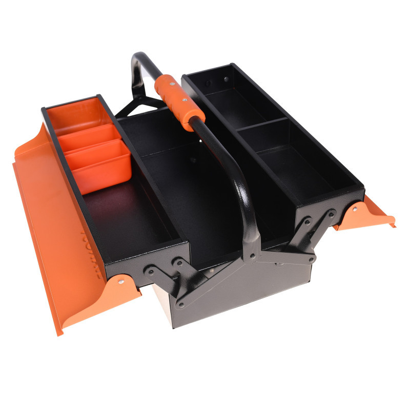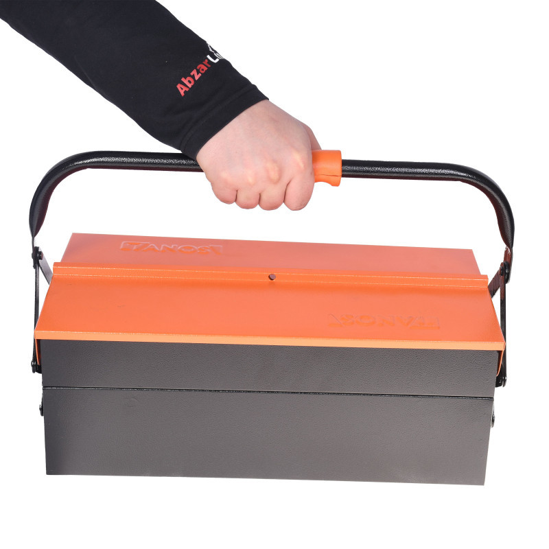 جعبه ابزار فلزی سه طبقه مدل AT_502 با رنگ بدنه مشکی و رنگ در های نارنجی تولید شرکت تانوس میباشد. طول این جعبه ابزار 50 سانتی متر، عرض آن در حالت بسته 22 سانتی متر و در حالت باز 50 سانتی متر است. این جعبه ابزار سه طبقه ( 1 طبقه کف ثابت و دو طبقه متحرک) فقط در ترکیب رنگی مشکی_نارنجی تولید میشود. حالت باز و بسته شدن این جعبه ابزار به صورت اتوماتیک است. ضخامت بالای ورقه آهنی و پرچ های محکم فولادی این کالا را به جعبه ابزاری با کیفیت و محکم تبدیل کرده است. جهت قرار دادن ابزارآلات ریز 3 عدد پالت پلاستیکی ( 1 بزرگ،2 کوچک) داخل آن تعبیه شده است و فضای کافی برای گذاشتن انواع ابزارآلات را داراست. دسته پلاستیکی ارگونومیک قرار داده شده باعث میشود هنگام حمل این جعبه ابزار احساس خستگی نکنید.همچنین رنگ ضد خش الکترواستاتیک روی بدنه از هر گونه رنگ پریدگی و خط و خش روی این جعبه جلوگیری میکند.