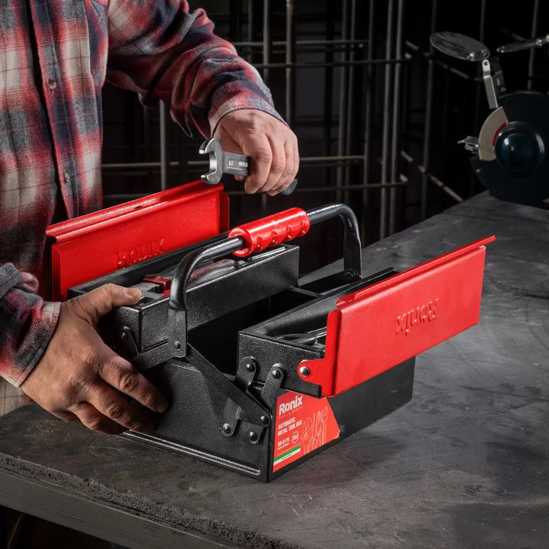 ابعاد 3 محفطهی این جعبه ابزار عبارتند از : دو محفظهی کوچکتر با ابعاد 5×10×30 سانتیمتر و یک محفظهی بزرگتر با ابعاد 10×20×30 سانتیمتر؛ در قسمت میانی دستهی فلزی این جعبه ابزار رونیکس، یک دستگیرهی پلاستیکی ABS ارگونومیک قرمز رنگ به طول 11.5 سانتیمتر قرار داده شده است که به خاطر جنس نرم و راحت خود و به دلیل داشتن جای انگشت گذاری، حمل و نقل جعبه را آسان و بدون خستگی کرده است. درب اصلی این جعبه ابزار اتوماتیک، به صورت خودکار است و به شکل کاملا منظم باز و بسته میشود.