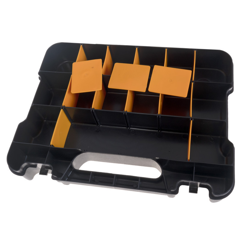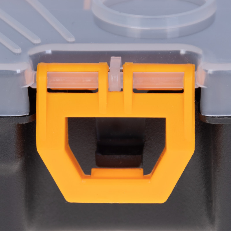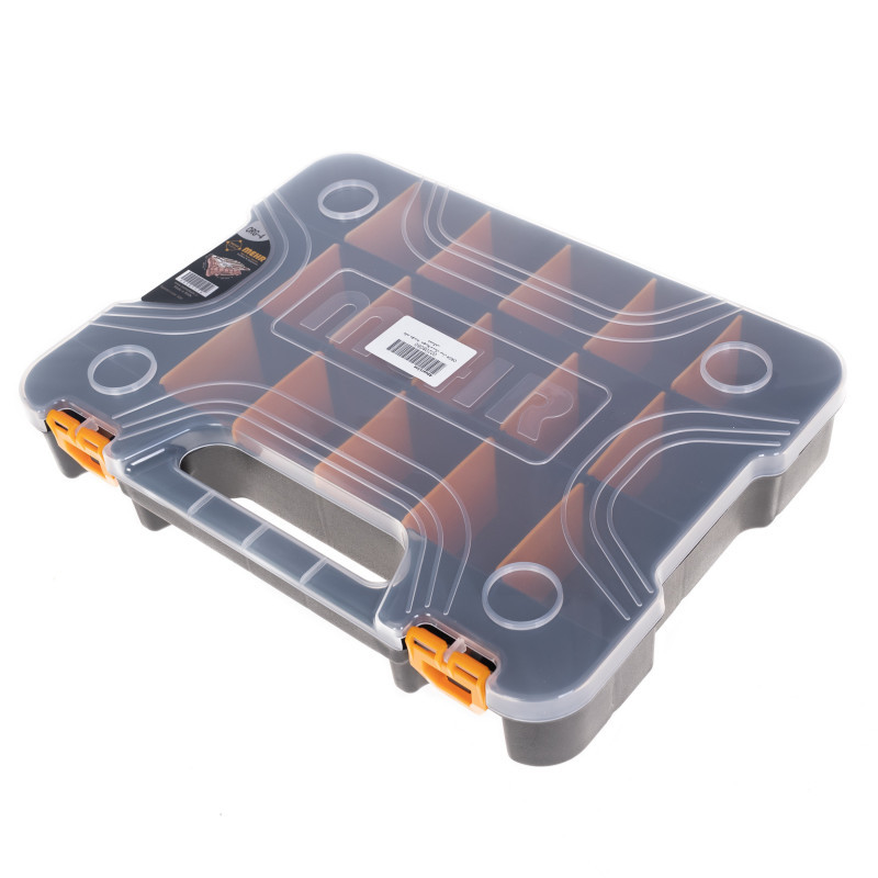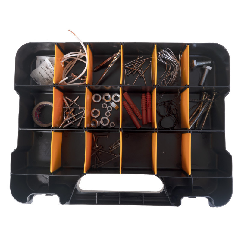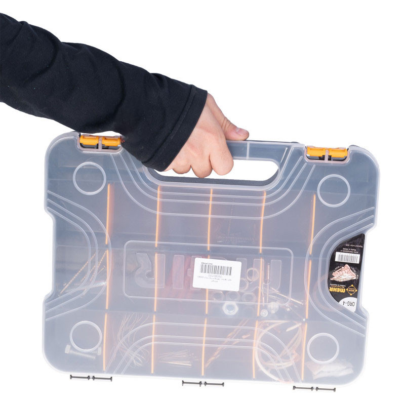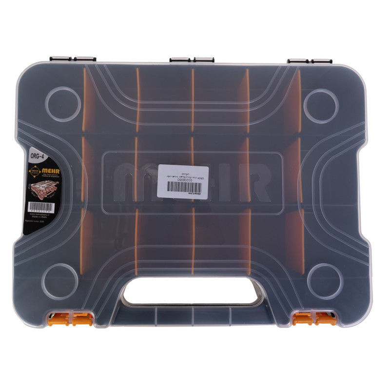 از جعبه ابزار پلاستیکی مهر میتوانید برای برای نگهداری و نظمدهی انواع ابزار و وسایل کوچک کارگاهی و فنی از جمله میخ، پیچ، مهره، رولپلاک، واشر، چسب، پرچ، بست و سایر قطعات کوچک مورد نیاز استفاده کنید.این جعبه تقسیم کنندهی یکطبقه، از پلاستیک شفاف مرغوب درجه یک با حجم داخلی کلی 2 لیتر ساخته شده است و مجموعا دارای 22 محفظه می باشد. 18 تا از این محفظه ها اندازهی متوسط دارند و 4 تای آنها کوچک هستند. اندازهی محفظههای متوسط، به وسیلهی جابجایی تقسیمکنندههای پلاستیکی، قابل تغییر و کم و زیاد شدن است. این جعبه نظم دهنده ابزار با وزن 690 گرم و ابعاد کلی 60 × 280 × 355 میلیمتر، در کشور ایران و توسط شرکت مهر پلاستیک ساخته شده و به بازار ابزار عرضه شده است.