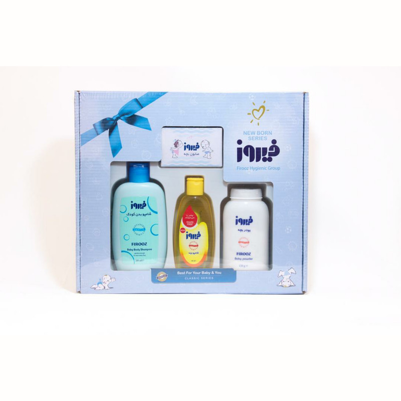 جعبه هدیه فیروز با محتویات شامپوی سر نوزاد، شامپوی بدن نوزاد، صابون بدن نوزاد و پودر بچه نیاز های بهداشتی نوزادن شما عزیزان را فراهم میکند