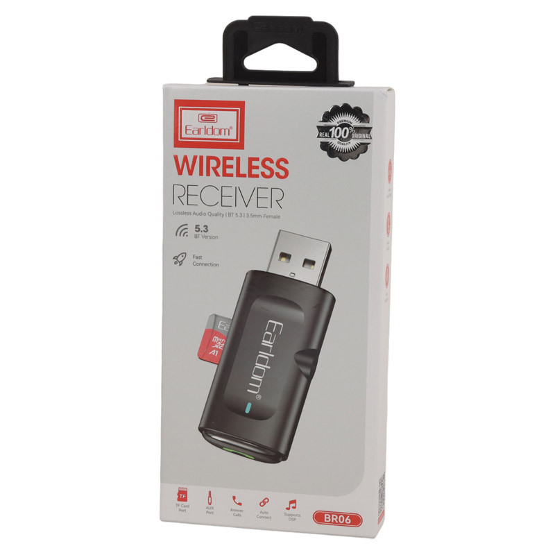 گیرنده بلوتوث ماشین و رم ریدر ارلدام مدل ET-BR06 قابلیت پاسخ دهی به تماس ها و انتقال موسیقی از طریق بلوتوث نسخه 5.3 با برد حدود 15 متر را دارد و دارای رابط اتصال از نوع USB جهت تامین انرژی و اتصال به ضبط خودرو و دستگاه های سازگار میباشد ، بدنه ساخته شده از متیرال پلاستیک مقاوم در برابر آسیب های احتمالی نظیر ضربه و فشار میباشد و قابلیت پشتیبانی از کارت حافظه میکرو SD و جک 3.5 میلی متری صدا، به همراه کابل AUX را دارد