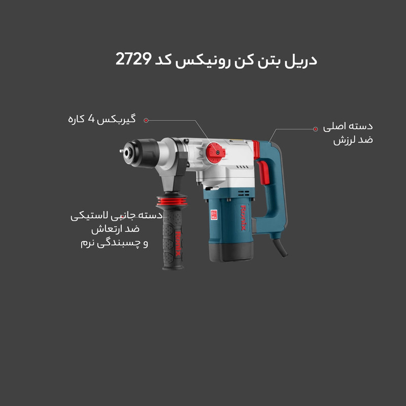 چنانچه به دنبال دریل بتن کن هستید، می‌توانید محصولات شرکت «Ronix» «رونیکس» را بررسی و یک مورد را با اطمینان خاطر انتخاب کنید. و اما محصول پیش روی شما یکی از دریل بتن کن های ساخت رونیکس است که تحت عنوان مدل 2729 به بازار عرضه شده است. منبع تغذیه این ابزار برق بوده، ولتاژ آن 220 ولت و دارای ابزارگیر چهار شیار SDS Plus است. وزن این ابزار 4.6 کیلوگرم است. سرعت گردش آزاد این محصول 1000 دور بر دقیقه بوده، نرخ ضربه آن 4300 ضربه در دقیقه و توان آن 1200 وات است. حداکثر قطر سوراخ‌کاری در مصالح این محصول 29 میلی‌متر است و توان ضربه آن 4.6 ژول میباشد. این دستگاه به هنگام کار نیروی بسیار مطلوبی در کلاس وزنی خود را دارا میباشد و دارای استاندارد ISO 9001: 2008 بوده و از عملکرد بسیار خوبی برخوردار است. این دستگاه از متربال درجه 1 تحت استانداردهای روز اروپا تولید و به بازار عرضه گردیده است.