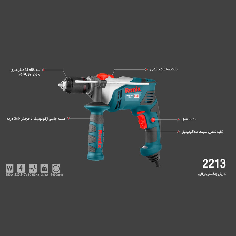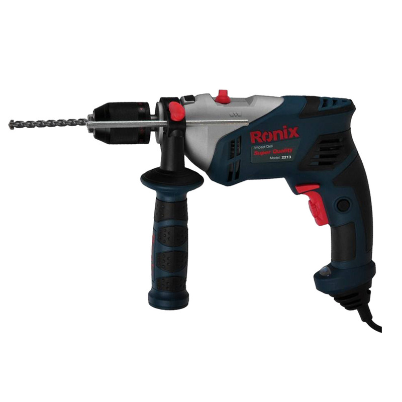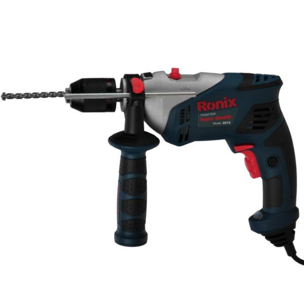 دریل 2213 از سری دریلهای چکشی ساخت شرکت «رونیکس» (Ronix) است. این دریل توانی معادل 650 وات دارد و همانطور که گفته شد از قابلیت چکشی برخوردار است. یعنی برای سوراخکاری روی سطوح ساختمانی سخت مانند سیمان با استفاده از قابلیت چکشی یا ضربهای راحتتر میتوان این کار را انجام داد. سرعت گردش موتور این دریل در حالت آزاد 3000 دور بر دقیقه است که این سرعت برای یک دریل خانگی مناسب است. همچنین از قابلیت گردش به دو جهت چپ و راست برخوردار است که این ویژگی با کمک دکمه قرار گرفته دربالای کلید روشن و خاموش قابل تظیم است. حداکثر قطر سوراخکاری با این دریل در سطوح چوبی 13 میلیمتر و در سطوح فلزی و مصالح ساختمانی هم 13 میلیمتر است. طول کابل در نظر گرفته شده برای این دریل سه متر است. گفتنیست همراه این دریل یک عدد کیف حمل و یک دسته کمکی هم ارائه میشود.