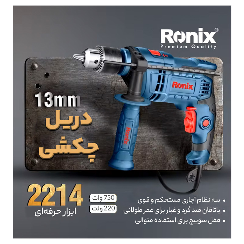 | سایر توضیحات | - مجهز به موتور قدرتمند 750 واتی باکیفیت و با طول عمر بالا - دارای بدنه ارگونومیک با وزن مناسب جهت استفاده های طولانی مدت -دارای سه نظام آچاری 13 میلیمتری تمام فلزی، بسیار مستحکم و قوی - دارای حداکثر تعداد ضربه در حالت چکشی، برای استفاده بر سخت ترین سطوح -دارای بدنه کوچک و جمع و جور با حداکثر توان - مجهز به دسته جانبی 360 درجه با خاصیت ضد لرزش برای افزایش دقت در کار در تمامی جهت ها - دارای دکمه گازی جهت کنترل سرعت دریل از حداقل تا حداکثر - دارای دکمه الکترونیک ضد غبار چپگرد/راستگرد - دارای سویچ ضد غبار برای کاهش نفوذ غبار |