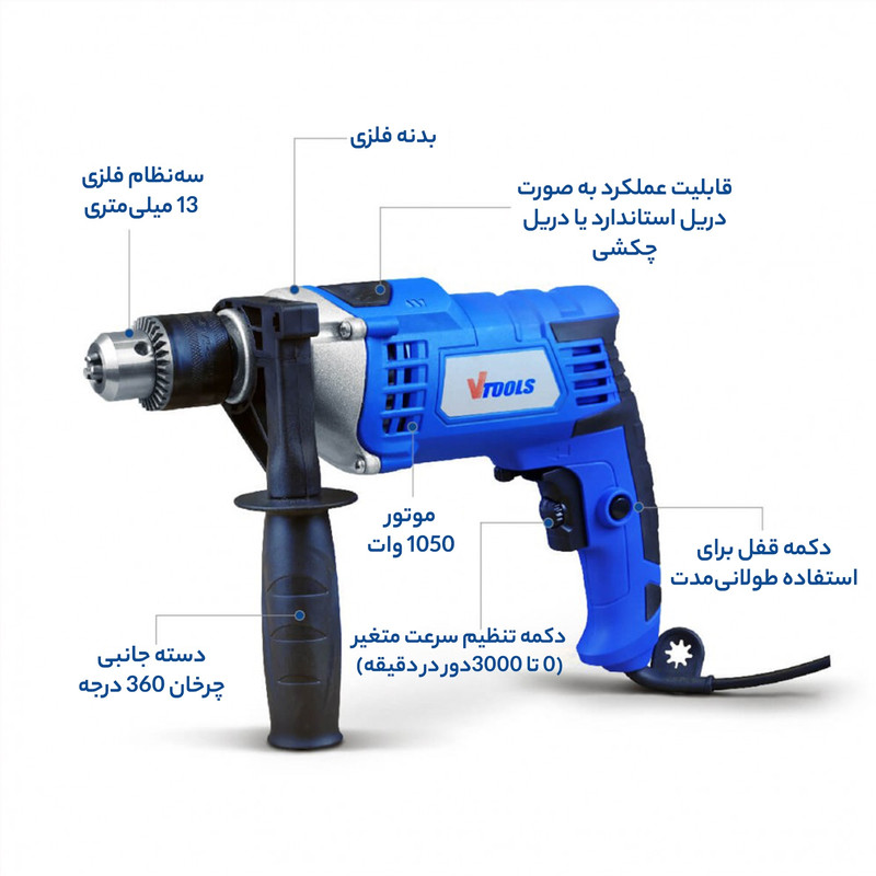 حداکثر قدرت موتور 1050 وات که آن را برای سوراخکاری در موادی از جمله چوب، فولاد و بتن مناسب میکند. ماشه سرعت متغیر به شما این امکان را میدهد که سرعت حفاری را کنترل کرده و سرعت را بر اساس نیاز خود تنظیم کنید. سه نظام 13 میلیمتری به شما این امکان را میدهد متهها را با توجه به کاربردهای مختلف حفاری (چوب، فولاد یا بتن) تغییر دهید. دکمه قفل برای کنترل سرعت، خستگی را در ساعات طولانی کار کاهش می دهد.