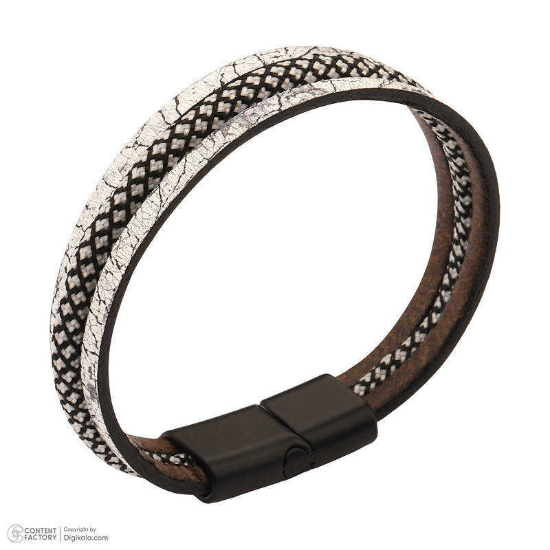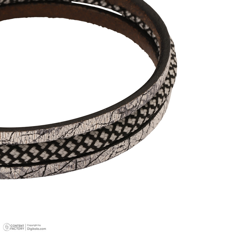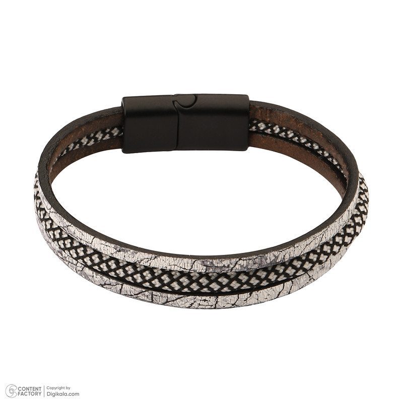 این دستبند از **چرم طبیعی با روکش نقرهای ترکدار** ساخته شده و دارای **دو بند چرمی با بافت متفاوت** است که در کنار هم ترکیبی چشمنواز و شیک ایجاد میکنند. قفل آهنربایی مشکی مات تعبیهشده در پشت دستبند، علاوه بر سهولت در استفاده، ظاهری مینیمال و تمیز به آن بخشیده است.