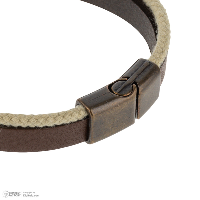 ویژگی اصلی طراحی این مدل، ساختار دو لایه و ترکیبی آن است. بدنه اصلی دستبند از یک نوار چرم (صنعتی با درجه کیفی بالا) به رنگ قهوهای تیره تشکیل شده است. بر روی این لایه چرمی، یک رشته بافت طنابی (کنفی/نخی) به رنگ کرم روشن قرار گرفته که با اتصالاتی محکم به بدنه اصلی متصل شده است. این ترکیبِ متریال (چرم و پارچه) و تضاد رنگی میان قهوهای و کرم، ظاهری کژوال به محصول بخشیده که برای استفادههای روزمره و ست کردن با پوششهای غیررسمی مناسب است.
