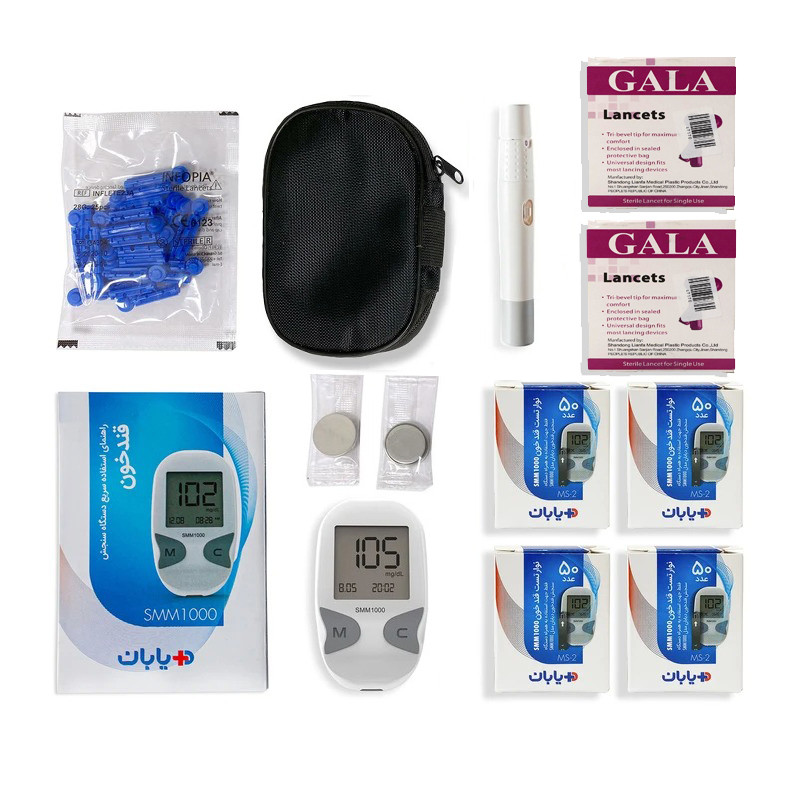 دستگاه تست قند خون دیابان مدل SMM1000 به همراه 4 بسته نوار 50 عددی و 2 بسته 100 عددی سورن لنست گالا ساخت ایران مطابق با جدیدترین تکنولوژی کشور کره جنوبی می باشد. اقلام همراه دستگاه شامل 200 عدد نوار تست (4 بسته ی 50 تایی به صورت جداگانه)، قلم سوزن زن، 225 عدد سوزن(25 عدد در داخل پکیج دستگاه + 2 بسته ی 100 تایی به صورت جداگانه)،، دو عدد باتری سکهای و دفترچه راهنمای فارسی و کیف نگهداری میباشد. مقدار خون موردنیاز برای اندازهگیری قند خون توسط دستگاه 0٫5 میکرولیتر است. پس از قرار دادن قطرهی خون روی محل مشخصشدهی نوار، 5 ثانیه طول میکشد تا قند خون روی صفحه به نمایش در آید. دستگاه قندخون دیابان دارای 300 حافظه، قابلیت تعیین شناسهی شخصی و حالت انجام تست و میانگینگیری از نتایج بوده و برای اندازهگیری قند خون تنها به 0٫5 میکرولیتر خون نیاز دارد. همچنین کاربر میتواند به صورت دستی و یا با اسکن صفحه نمایش (OCR) نتایج قندخون خود را در نرم افزار فارسی سیناکر در تلفن همراه ثبت کند.