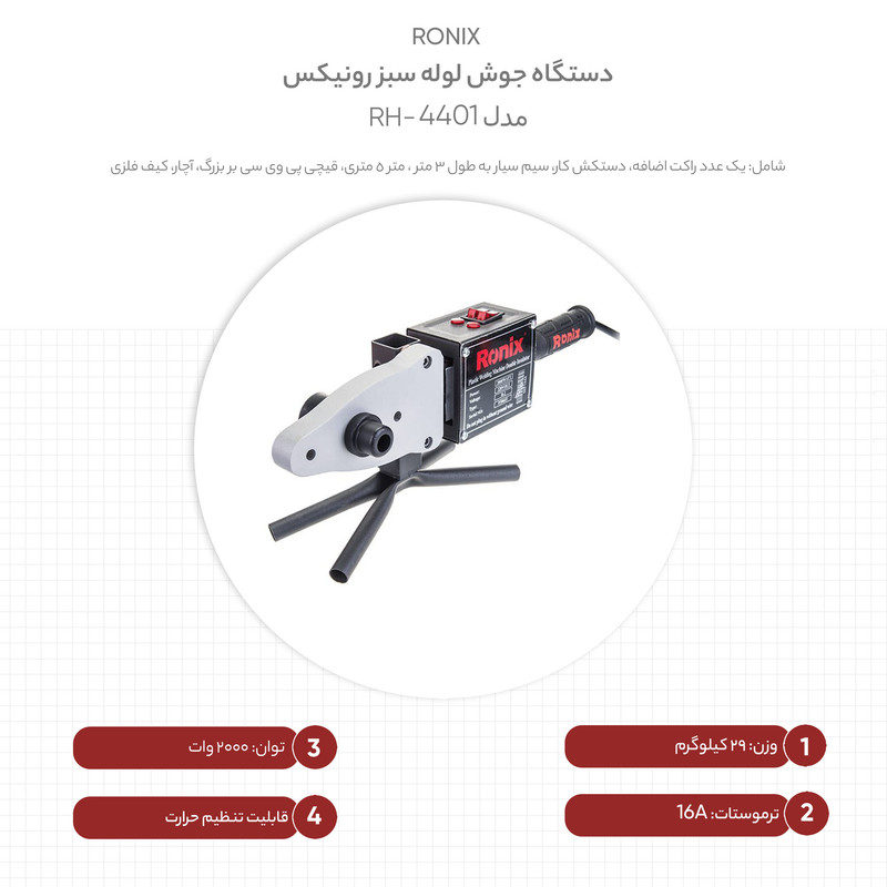 امروزه استفاده از لولههای فلزی منسوخ شده است بهجای آن از لولههای پلیمری استفاده میکنند. لولههای پلیمری به لولههایی از جنس پلاستیک گفته میشود که انواع و قطرهای مختلفی دارند. ازجملهی گونههای لولههای پلیمری میتوان به PE، PB و PP-R اشاره کرد. از دلایلی که باعث بروز این مورد شده است میتوان به عمر بیشتر لولههای پلاستیکی، حفظ انرژی و انجام لولهکشی در زمان کمتر اشاره کرد. برای انجام لولهکشی با این نوع لولهها از دستگاه جوشی نظیر دستگاه جوش لولهی پلیمری استفاده میکنند. مدل RH-4401 نمونهآی از این دستگاه است که توسط شرکت «رونیکس» (Ronix) تولید میشود. این محصول با برق شهری (230 ولت) کار میکند و توان آن به 2000 وات میرسد. دو المنت حرارتی برای این مدل در نظر گرفتهشده است. پس از رسیدن حرارت سوکتها به مقدار تنظیمشده، المنتها بهصورت خودکار خاموش میشوند. در کارتن این محصول و در کنار این دستگاه، علاوه بر پایه فلزی مخصوص، یک راکت اضافی، یک آچار (برای باز کردن و بستن سوکتها)، یک متر 5 متری، یک سیم سیار و یک دستکش وجود دارد که همگی در یک کیف فلزی قرار داده شدهاند. رونیکس یکی از برندها و شرکتهای داخلی تولیدکنندهی ابزار است که در بازار و در میان شرکتهای داخلی تولیدکنندهی ابزار جایکاه مناسبی در بازار دارد. برای استفاده از دستگاه جوش لولهی پلیمری مانند مدل RH-4401، بهتر است از دستکش ایمنی استفاده کنید.