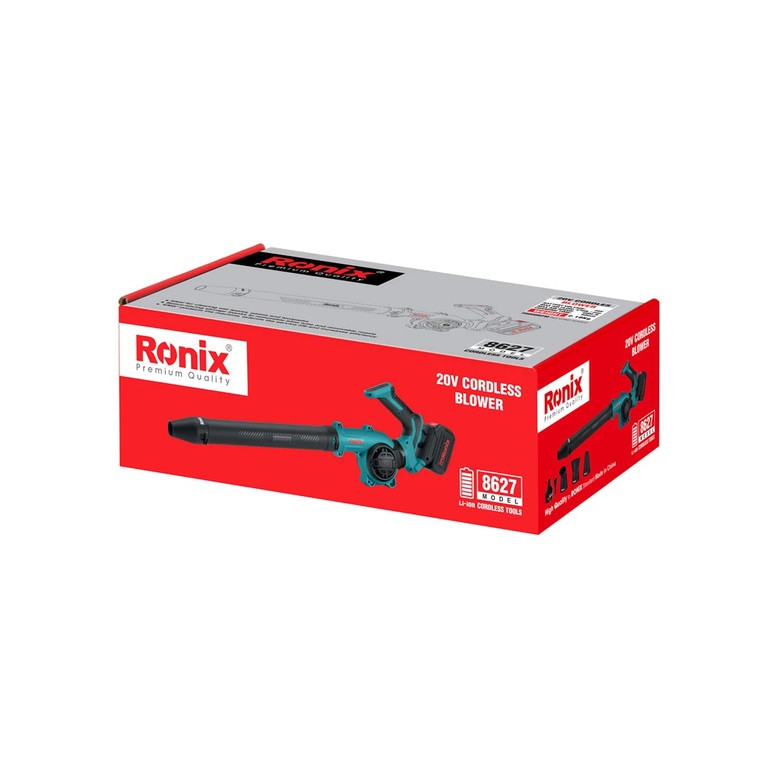 این بلوور شارژی رونیکس دارای لوله دمنده و نازلهای جداشونده است که استفاده و نگهداری از آن را راحتتر کرده است. باتری این بلوور شارژی لیتیومیونی با ولتاژ ۲۰ ولت و ظرفیت ۴۰۰۰ میلیآمپر ساعت است که با سایر ابزارآلات شارژی 20 ولت سری 86 رونیکس سازگار است.