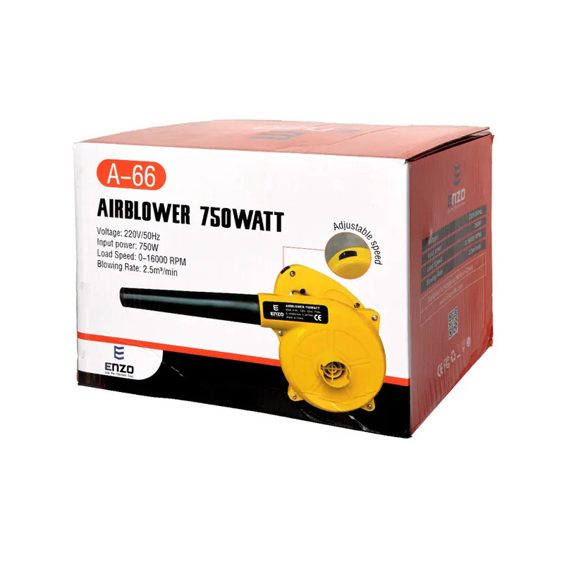 دمنده ENZO مدل A-66 مجهز به یک موتور با توان کلی 750 وات بوده که سرعت گردش موتور داخلی آن در حالت آزاد 16000 دور در دقیقه است و هوای خروجی آن معادل 2.5 متر مکعب بر دقیقه می باشد، همچنین انرژی مورد نیاز آن نیز از طریق برق شهری با ولتاژ 220 ولت تامین می گردد. سرعت گردش باد ایجاد شده توسط پمپ دمنده ENZO می تواند برای گرد و خاک از سطوح مختلف شامل اجزای داخلی کامپیوتر و … مورد استفاده قرار گیرد، با استفاده از این پمپ می توانید به راحتی گردو خاک داخل کیس را تمیز کنید و از شر سر و صدای اضافی فن ها بواسطه گردو خاک راحت شوید. این دستگاه به صورت عملکرد دوگانه قابل استفاده است به این مفهوم که هم توان دمندگی و هم توان مکندگی هوا را توامان داراست. به طوری که با داشتن یک لوله پلاستیکی قادر است بخش های مختلفی که دست کاربر به آن ها دسترسی ندارد را نیز تمیز نماید. بر روی بدنه دستگاه دمنده انزو A-66، یک کلید فیزیکی نیز تعبیه شده تا کاربر از آن جهت تنظیم سرعت باد مطابق با نیاز خود استفاده نماید