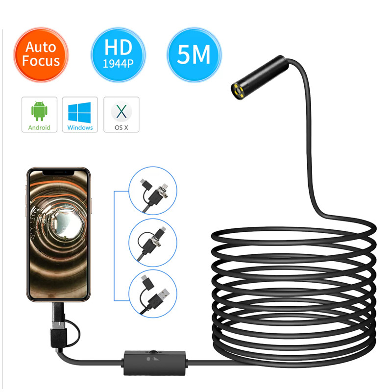 دوربین آندوسکوپی (شلنگی) اتوفوکوس 5 مگاپیکسل با کابل 10 متری مرغوب و با کیفیت از جدیدترین نمونه دوربین های آندوسکوپی موجود در دنیا با قدرت تصویر برداری HD و دوربین اتو فوکوس می باشد. پروپ دوربین دارای استاندارد IP67 و کاملاً ضد آب که باعث می شود تا کاربران بتوانند در شرایط محیطی متفاوت از این دوربین آندوسکوپی اتوفوکوس نهایت استفاده را ببرند. این دوربین می تواند با استفاده از نرم افزار Inskam تصویر را با کیفیت بالا در گوشی های هوشمند نمایش داده و امکاناتی همچون گردش تصویر بصورت 360 درجه ، امکان نمایش همزمان یک تصویر گرفته شده و مقایسه آن با تصویر زنده دوربین ، زوم تصویر و همچنین امکان تهیه عکس و فیلم در حین تصویربرداری از محل های دلخواه را در اختیار کاربر قرارداده و همزمان با آن در کارت حافظه ذخیره سازی نماید.دارای 4 LED ویژه پر نور کنار دوربین که می تواند در کاوشهای باستان شناسی و اکتشافات معدنی و مکان های تاریک کاربرد موثری داشته باشد. این سری از دوربین های شلنگی اتوفوکوس 5 مگاپیکسل دارای یک دوربین با قطر پروب 11 میلیمتر با قابلیت اتوفوکوس و رزولوشن 5 مگاپیکسل بوده و با طول کابل 10 متری و کابل نیمه سخت با قابلیت اتصال به انواع موبایلهای اندرویدی عرضه می شود.