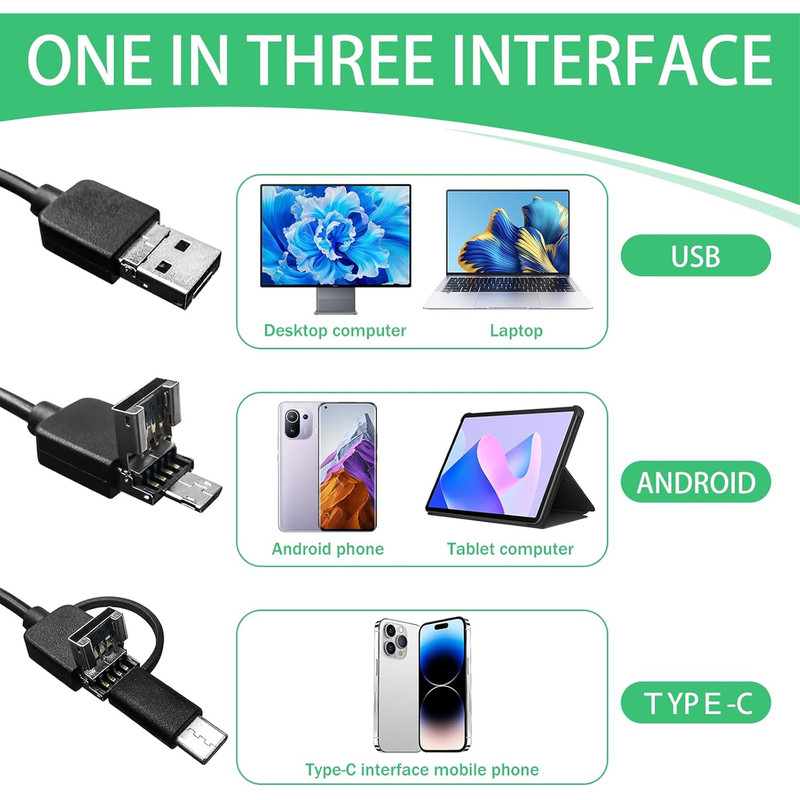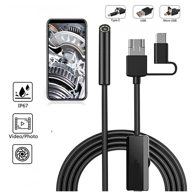 دوربین آندوسکوپی مدل ضدآب10Meters New با کابل 5 متر سخت انعطاف پذیر فنری با کانکتور میکرو USB و Type-C و USB کامپیوتر شما با این نمونه می توانید به تلفن های همراه و یا تبلت ها متصل شده و از آن در موارد متعددی استفاده نمایید. با نصب نرم افزار در دستگاه تلفن همراه و یا تبلت اندروییدی خود و یا نصب نرم افزار ویژه بر روی کامپیوتر خود و اتصال دوربین شلنگی می توانید با وضوح بالا تصاویر را دریافت کنید. این وسیله کاربردهای بسیاری دارد ازجمله کاربردهای آن جستجو و نجات،مشاهده داخل خط لوله، بازرسی موتور، نظارت تصویری، بازرسی لوله فاضلاب ،بازرسی دیوار، و غیره