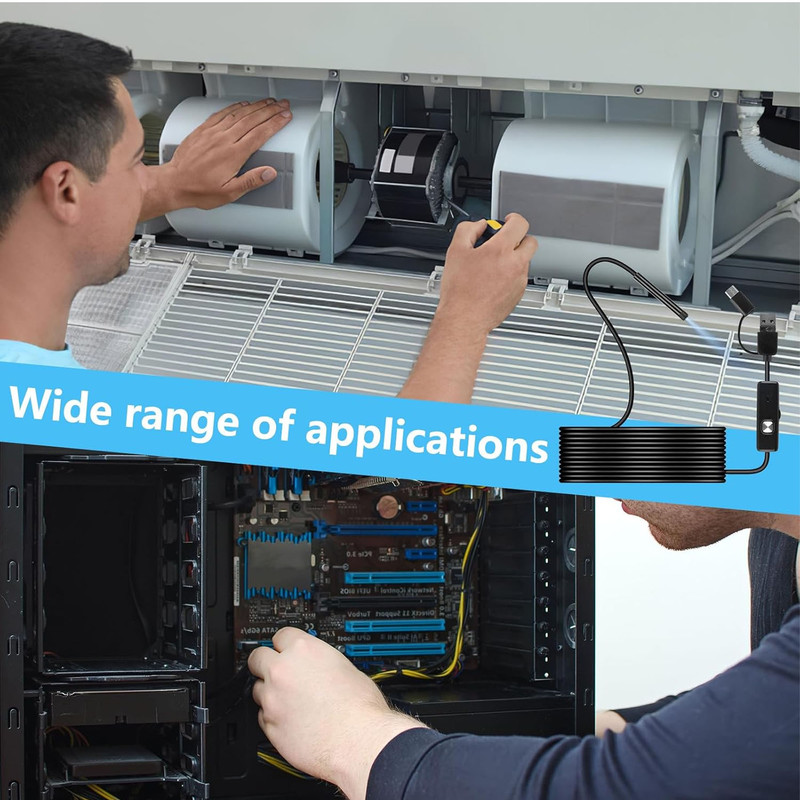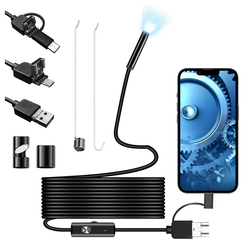 دوربین شلنگی مدل ضدآب کد 10M NEW 2025 با کابل 10 متر سخت انعطاف پذیر فنری با کانکتور میکرو USB و Type-C و USB کامپیوتر شما با این نمونه می توانید به تلفن های همراه و یا تبلت ها متصل شده و از آن در موارد متعددی استفاده نمایید. با نصب نرم افزار در دستگاه تلفن همراه و یا تبلت اندروییدی خود و یا نصب نرم افزار ویژه بر روی کامپیوتر خود و اتصال دوربین شلنگی می توانید با وضوح بالا تصاویر را دریافت کنید. این وسیله کاربردهای بسیاری دارد ازجمله کاربردهای آن جستجو و نجات،مشاهده داخل خط لوله، بازرسی موتور، نظارت تصویری، بازرسی لوله فاضلاب ،بازرسی دیوار، و غیره است.