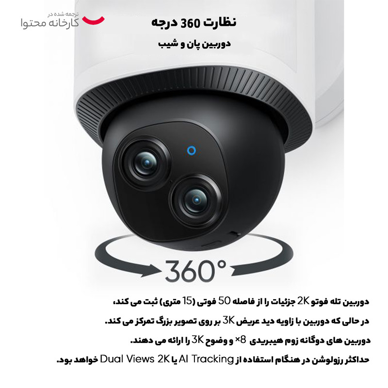برای مشاهده کامل، 360 درجه به صورت افقی حرکت دهید. هوش مصنوعی افراد را شناسایی می کند و حرکات آنها را ردیابی می کند. گشت زنی خودکار طبق برنامه با نصب کارت microSD (تا 128 گیگابایت) یا اتصال به eufy HomeBase S380، همیشه روشن و همیشه ضبط می‌کند زمانی که حافظه محلی فعال شده است. فعالیت ها و افراد را می توان همیشه تحت نظر داشت. دوربین تله فوتو 2K جزئیات را از فاصله 50 فوتی (15 متری) ثبت می کند، در ح...