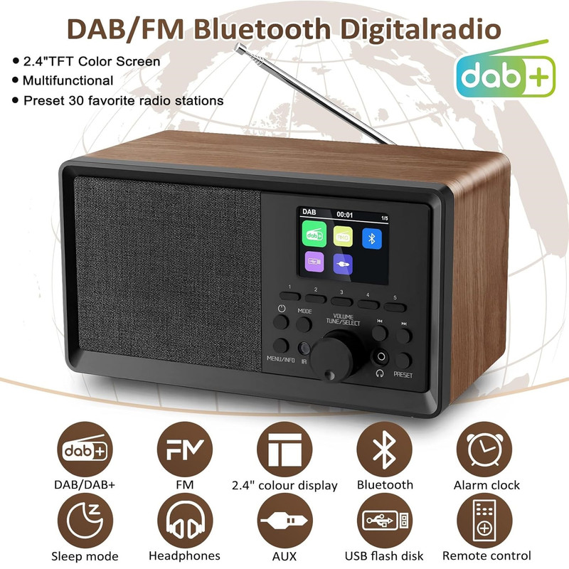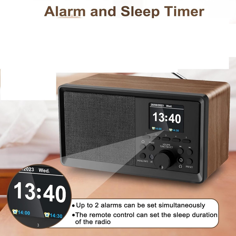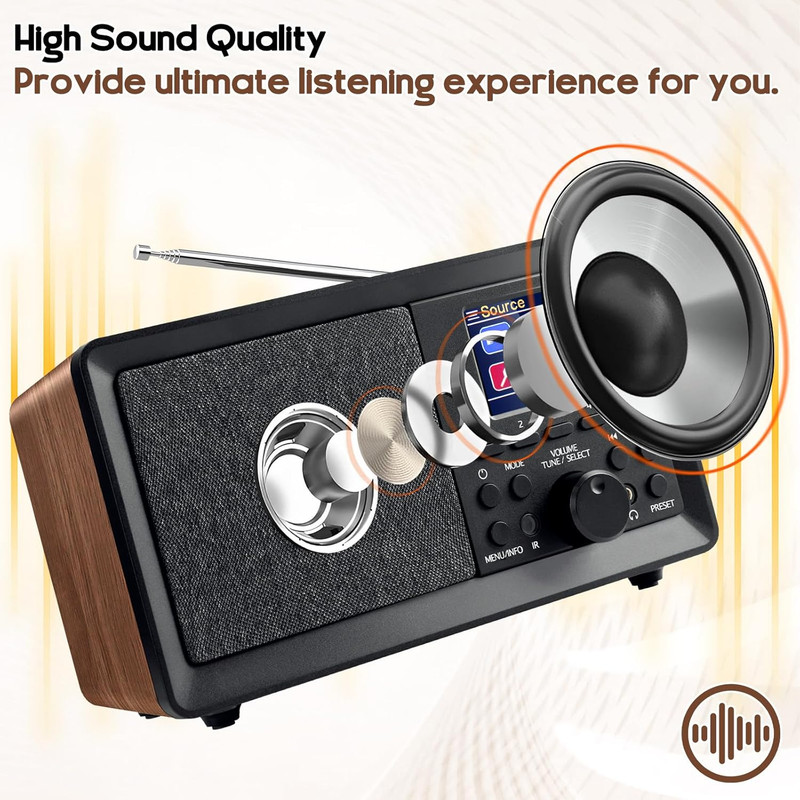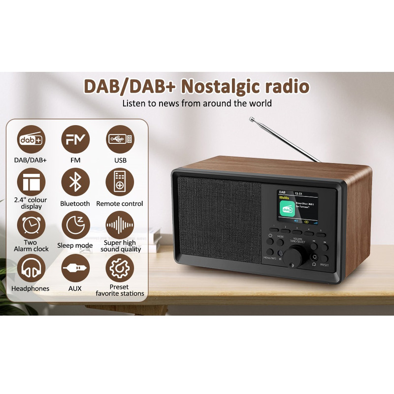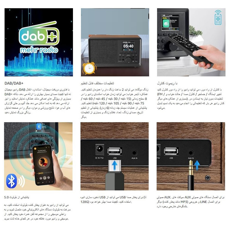 | امکانات و قابلیتها | رادیو دیجیتال چند منظوره: رادیو دیجیتال پیشرفته DAB/DAB+/FM، رادیو FM و رادیو دیجیتال DAB+ مجموعه متنوعی از صدای دیجیتال با جزئیات بالا، راه اندازی آسان و جستجوی خودکار سریع را ارائه می دهند. صفحه نمایش رنگی 2.4 اینچی TFT برای نمایش واضح تر کانال ها و منوها، ارتقاء هوشمند برای راه اندازی و ناوبری آسان. چوب اکالیپتوس منحصر به فرد برای رنگ آبی کلاسیک و شیک. . حالت های پخش چندگانه: رادیو را می توان به سرعت با یک تلفن هوشمند الکترونیکی از طریق بلوتوث جفت کرد. همچنین می توان آن را از طریق هارد USB (تا 128 گیگابایت)/ کابل AUX برای گوش دادن به موسیقی در هر زمان و مکان به رادیو متصل کرد و دارای جک 3.5 میلی متری هدفون است، بنابراین می توانید نه تنها از آن به عنوان رادیو بلندگو استفاده کنید، بلکه از موسیقی شخصی خود نیز بدون نگرانی لذت ببرید. جستجوی دستی ایستگاه و حافظه ایستگاه: در حالت DAB/FM، میتوانید ایستگاههای رادیویی را به صورت خودکار یا دستی هم در واحد اصلی و هم روی کنترل از راه دور جستجو کنید، همچنین میتوانید ایستگاههای مورد علاقه خود را از پیش تنظیم و ذخیره کنید، DAB+/FM میتواند تا 30 ایستگاه از پیش تعیین شده را ذخیره کند. ایستگاه های رادیویی مورد علاقه خود را سریعتر پیدا کنید. با بلندگوهای مونو می توانید صدایی واضح، شفاف و با کیفیت بالا داشته باشید. تنظیمات مختلف قابل تنظیم: زنگ دوگانه: می توانید 2 ساعت زنگ دار را همزمان تنظیم کنید. عملکرد تایمر خواب: می توانید زمان خواب استندبای رادیو را در 8 سطح زمانی (15 دقیقه / 30 دقیقه / 45 دقیقه / 60 دقیقه / 75 دقیقه / 90 دقیقه / 105 دقیقه / 120 دقیقه) تنظیم کنید. پشتیبانی از عملکرد سیستم چند زبانه (6 langulangulangulanguپشتیبانی برای تنظیم تاریخ، آهنگ زنگ، تعداد علائم زنگ و بسیاری از تنظیمات دیگر. پخش کننده DAB/FM/Bluetooth Radio Retro: دريافت سيگنال ديجيتال و دريافت سيگنال FM، مي توانيد در هر زماني در خانه به پخش اخبار از مناطق مختلف گوش دهيد. کیفیت صدای ممتاز و طراحی یکپارچهسازی با سیستمعامل زندگی شما را شادتر می کند. صفحه نمایش رنگی 2.4 اینچی: صفحه نمایش رنگی 2.4 اینچی واضح و خوانا به شما امکان می دهد ایستگاه های رادیویی، هنرمندان، زمان و سایر اطلاعات را به طور مستقیم و راحت نمایش دهید. DAB/DAB+: رادیو دیجیتال پیشرفته سیگنالهای دریافتی با کیفیت و متنوع را در اختیار شما قرار میدهد و دریافت DAB+ سریعتر و پایدارتر است. پشتیبانی از بلوتوث: می توانید از رادیو به عنوان پخش کننده بلوتوث استفاده کنید، به بلوتوث دستگاه الکترونیکی خود متصل شوید و به راحتی موسیقی را از مجموعه تلفن همراه خود پخش کنید. جستجوی خودکار و دستی : می توانید از طریق دکمه دستگاه و دکمه کنترل از راه دور جستجو کنید. همچنین یک دکمه حافظه سریع وجود دارد که می تواند 30 ایستگاه را ذخیره کند. کنترل آسان : رادیو را می توان با کنترل از راه دور تنظیم کرد (تغییر FM/کانال/جستجو/صدا/حالت خواب و بسیاری عملکردهای دیگر). عملکرد تایمر:می توانید 2 آلارم را به طور همزمان تنظیم کنید. عملکرد تایمر خواب: می توانید زمان خواب آماده به کار رادیو را تنظیم کنید، در مجموع 8 سطح زمانی وجود دارد. USB Mass Storage: می توانید از USB برای پخش صدا استفاده کنید، کیفیت صدا بهتر است. |