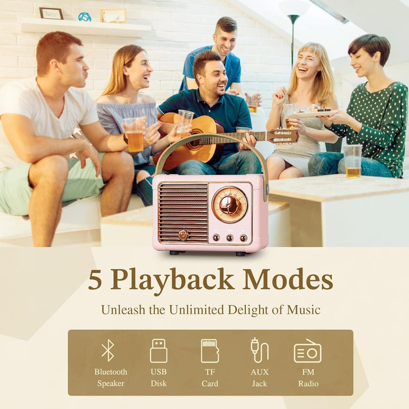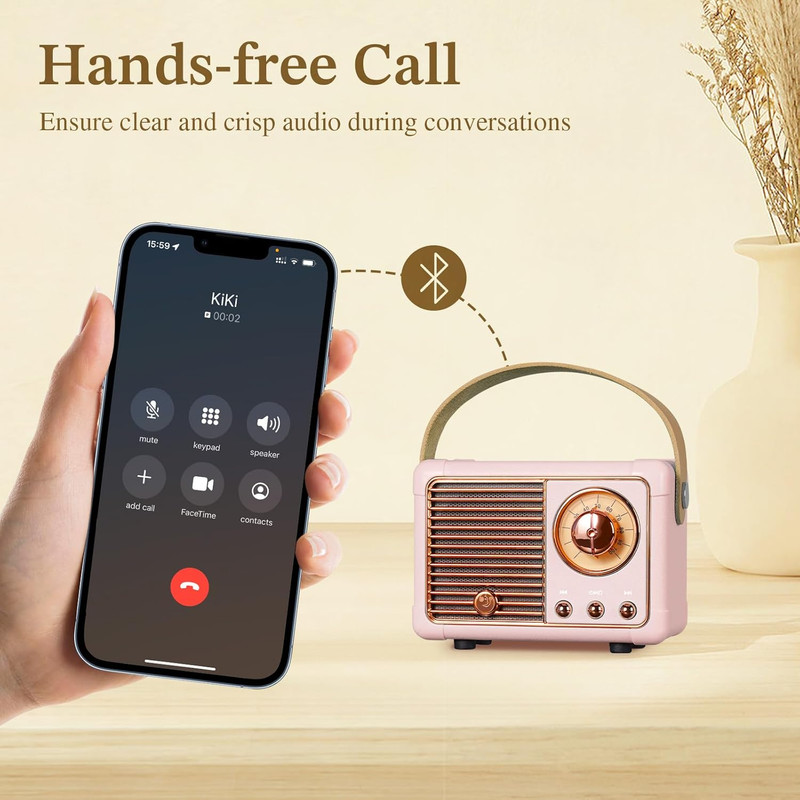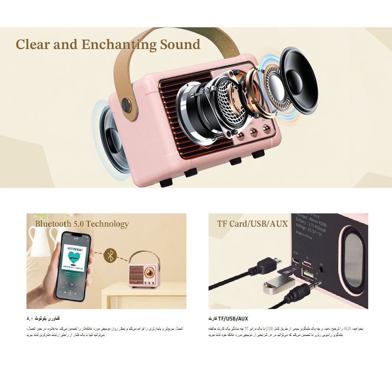 امکانات و قابلیت‌هارادیو اسپیکر بلوتوث کوچک prunus J-999 با رادیو FM، رادیو رترو قابل شارژ، بلوتوث 5.0 / صدای عالی، پشتیبانی از USB/TF/AUX/تماس‌های هندزفری رادیو اسپیکر بلوتوث رترو: با اسپیکر رترو قابل حمل ما، به دنیایی از نوستالژی و سبکی جاودانه قدم بگذارید. ظاهر رترو و ظریف این اسپیکر قدیمی، خاطرات دوران گذشته را زنده می‌کند و حسی از جذابیت قدیمی را به تجربه موسیقی شما می‌افزاید. از بین 5 رنگ، متناسب با سلیقه شخصی خود و مکمل فضای خود، انتخاب کنید. جمع و جور و قابل حمل: با ابعاد فقط ۲.۲ در ۳.۹ در ۲.۷ اینچ و وزن تنها ۰.۴۴ پوند، فوق‌العاده سبک و حمل آن آسان است. با یک دسته PU زیبا، می‌توانید آن را هر کجا که می‌روید با خود ببرید و این آن را برای علاقه‌مندان به موسیقی در حال حرکت ایده‌آل می‌کند. صدای غنی و فراگیر:این اسپیکر بلوتوث کوچک با بلندگوی قدرتمند ۳ وات و دیافراگم باس، کیفیت صدای استثنایی را ارائه می‌دهد و به شما این امکان را می‌دهد که از موسیقی مورد علاقه خود با وضوح و عمق عالی لذت ببرید. به علاوه، با باتری بادوام آن، می‌توانید با یک بار شارژ تا ۷ ساعت بدون وقفه با ۵۰٪ حجم صدا از پخش موسیقی لذت ببرید. این یک همراه عالی برای هر موقعیتی است. برآورده کردن نیازهای چندگانه: نه تنها می‌تواند به عنوان بلندگوی بلوتوث استفاده شود، بلکه می‌توانید با استفاده از کارت TF، درایو USB یا ورودی AUX از آهنگ‌های مورد علاقه خود نیز لذت ببرید. علاوه بر این، رادیو FM دارای حالت FM ((FM: 87-108MHz) برای گوش دادن به ایستگاه‌های رادیویی مورد نظر شما، با کابل AUX (شامل) به عنوان آنتن است. ※توجه: باید کابل AUX را به عنوان آنتن وصل کنید تماس بدون دخالت دست: این بلندگوی بی‌سیم قدیمی از فناوری بلوتوث ۵.۰ استفاده می‌کند و می‌تواند به راحتی با تقریباً همه دستگاه‌های دارای بلوتوث جفت شود. از آزادی تماس بدون دخالت دست لذت ببرید، زیرا بلندگوی بلوتوث رادیویی قابل شارژ ما به شما امکان می‌دهد با یک فشار یک دکمه به تماس‌ها پاسخ دهید. در حالی که در موسیقی مورد علاقه خود غرق می‌شوید، هرگز یک تماس مهم را از دست نخواهید داد.