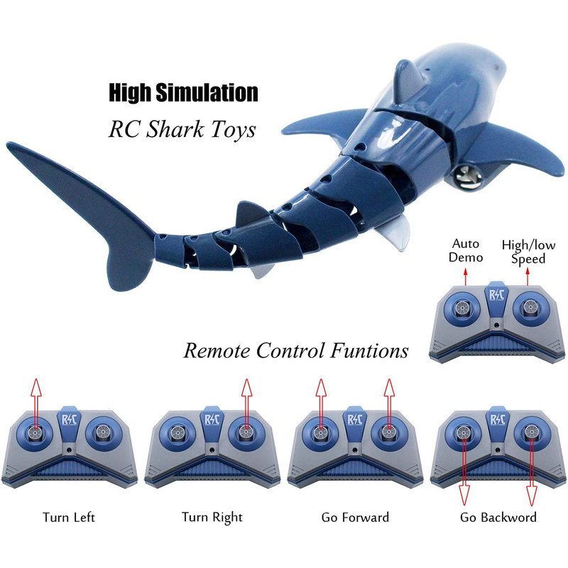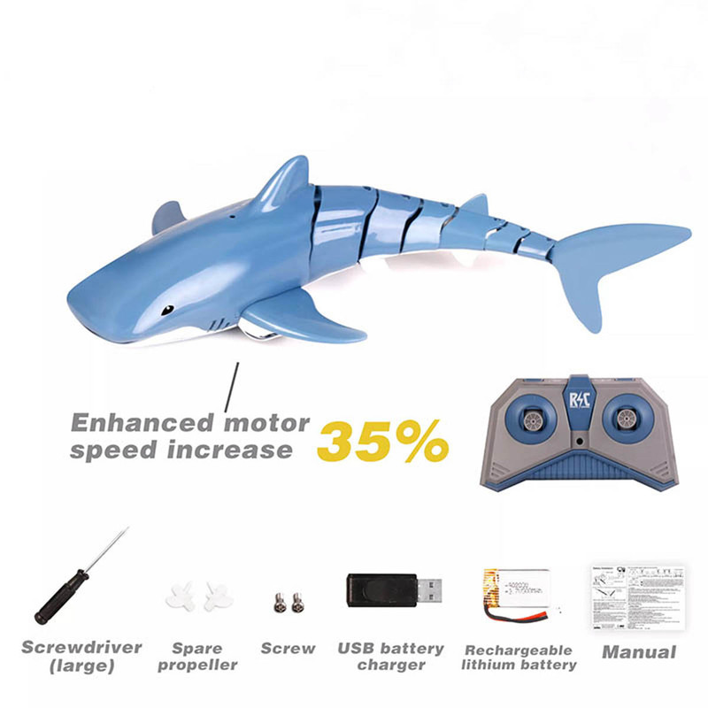 کوسه کنترلی شارژی شناگر با قابلیت شنا در آب و حرکت در جهات مختلف در آب و دارای قطعات ضد آب و دو موتور پرهای است. این کوسه به وسیله کنترل از راه دور هدایت میشود. ابعاد این اسباب بازی عبارتست از؛ ارتفاع 8.5، عرض 16 و طول 35.5 سانتیمتر. در بستهبندی این کوسه پیچ گوشتی کوچک، دو پره یدکی، پیچ یدکی، شارژر، باتری شارژی و دفترچه راهنما قرار دارد.