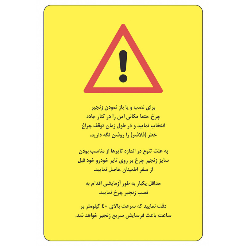 بعد از اطمينان يافتن از انتخاب سايز مناسب زنجير چرخ خودروي خود، توصيه مي شود حداقل يكبار در منزل به طور آزمايشي اقدام به نصب آن برروي خودروي خود نماييد تا مهارت لازم را در جاده هاي برفي و لغزنده و هواي سرد داشته باشيد.