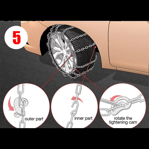 این زنجیر چرخ تایر خودرو را دربر میگیرد و مانع از لغزیدن آن روی یخ و برف میشود و با پوشش فلزی و یخشکن که بر روی لاستیک ایجاد میکند از لغزیدن خودرو بر روی برف و یخ جلوگیری میکند و به سادگی بر روی تایر نصب است.