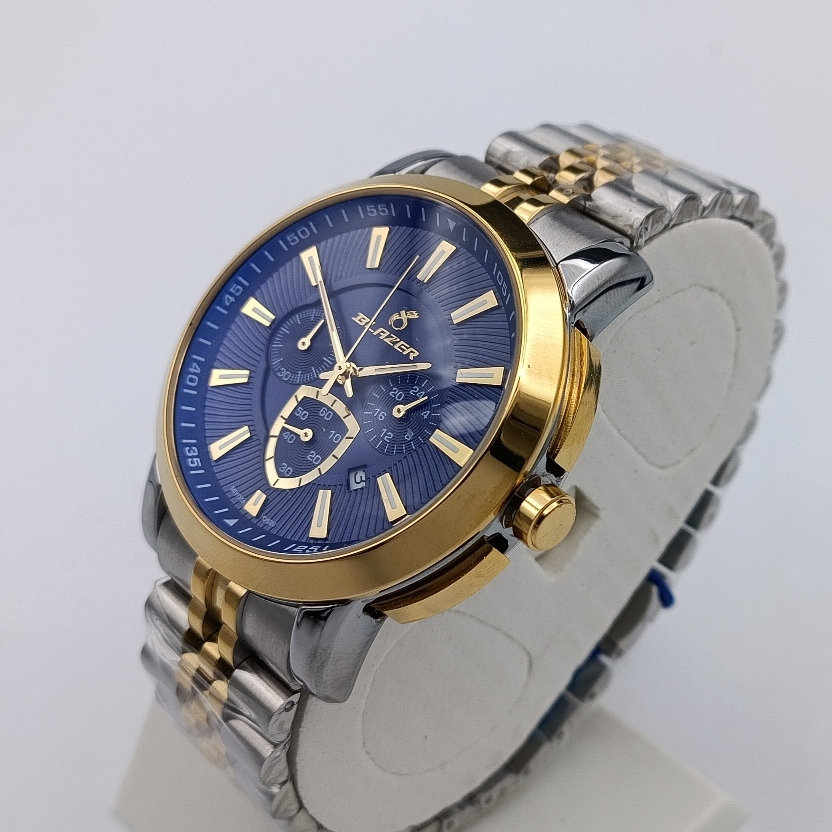 هارمونی چشمنواز قاب و بند دورنگ (طلایی و استیل) در کنار صفحه سرمهای رمزآلود، اولین چیزی است که توجه را به خود جلب میکند. رنگ طلایی، نمادی از موفقیت و اعتبار است، در حالی که رنگ سرمهای، وقار و عمق شخصیت شما را بازتاب میدهد. طراحان ساعت بلیزر با این ترکیب، ساعتی خلق کردهاند که هم برای جلسات رسمی کاری و هم برای رویدادهای خاص، یک همراه بینقص محسوب میشود. در نتیجه، این فقط یک ساعت نیست، بلکه بخشی از استایل منحصر به فرد شماست.