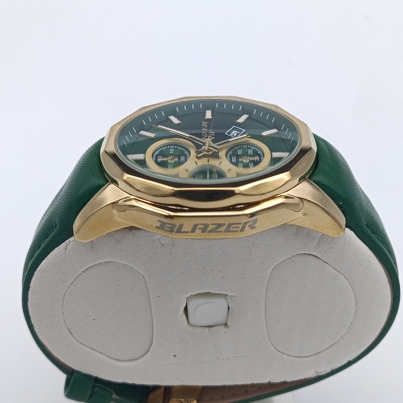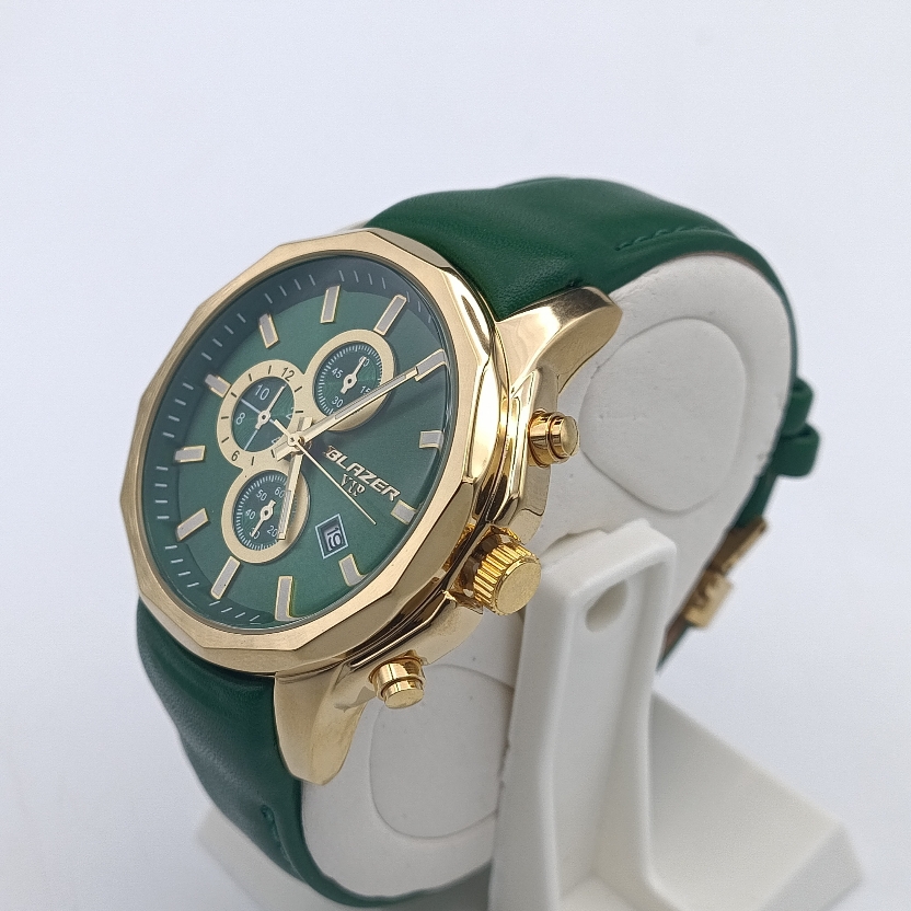 ساعت بلیزر طلایی صفحه سبز چرمی: بیانیهای از شکوه بر مچ دستان شما