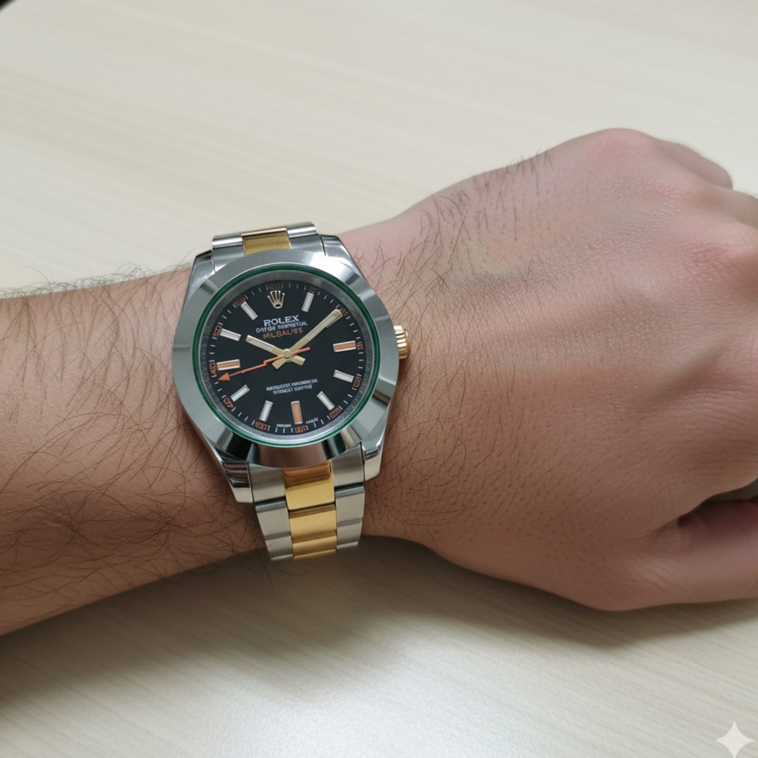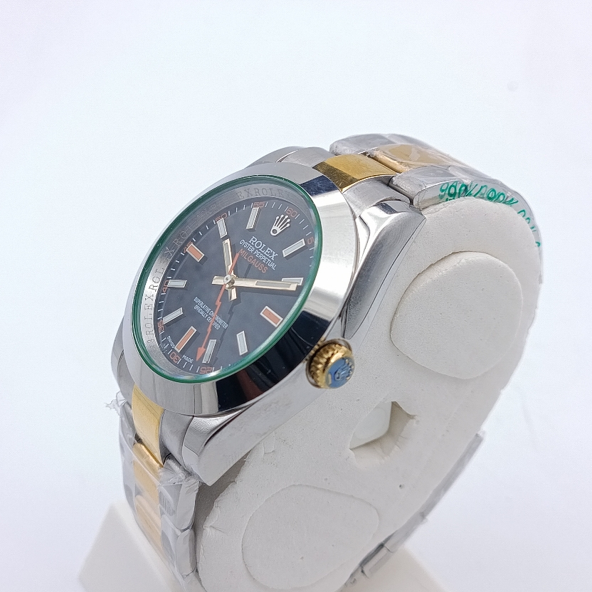 این فقط یک ساعت نیست؛ بلکه دعوتی است به دنیایی از دقت، زیبایی و اعتبار. همین امروز رولکس میلگاس دورنگ طلایی صفحه مشکی را به کلکسیون خود اضافه کنید و تفاوت را احساس کنید.